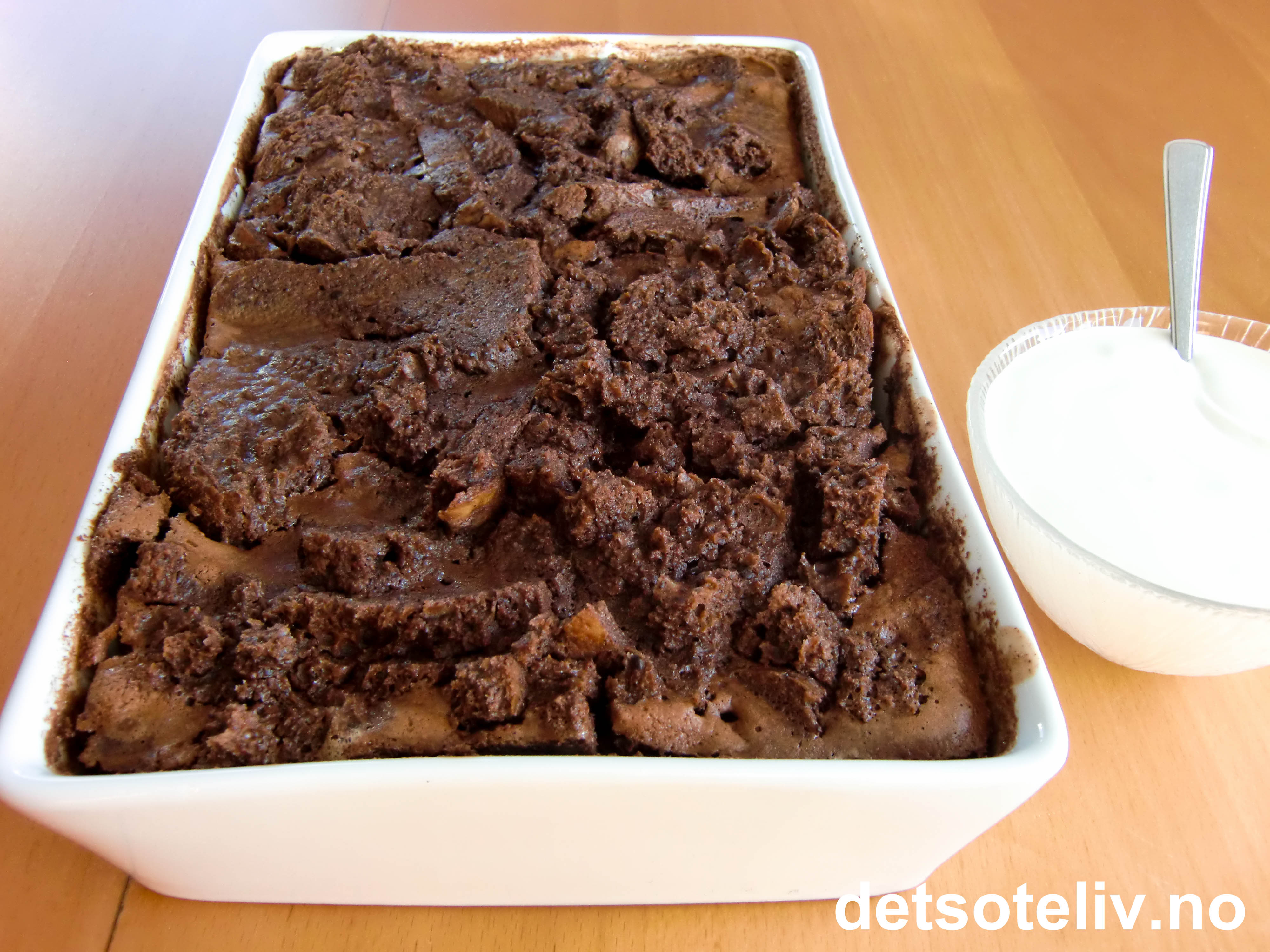 NB! Dette er en stor porsjon, så du må ha en nokså stor ildfast form. Det er selvsagt ikke noe problem å halvere oppskriften, hvis du ønsker å lage en mindre porsjon. Se alternativt oppskrift på "Sjokoladebrødpudding" på detsoteliv.no, som er beregnet til 1-2 porsjoner.