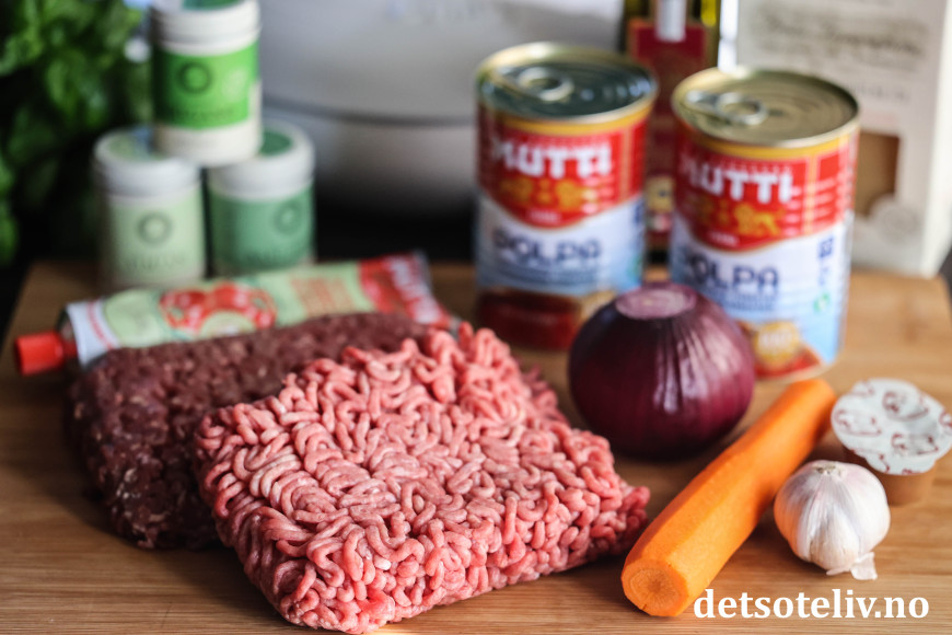 Finn frem ingrediensene til kjøttsausen. Finn frem en stor, ildfast gryte (jeg bruker her en buffetgryte med høye kanter, ca. 30 cm i diameter). Det er viktig at gryten tåler å både stå på kokeplaten og inni stekeovnen.