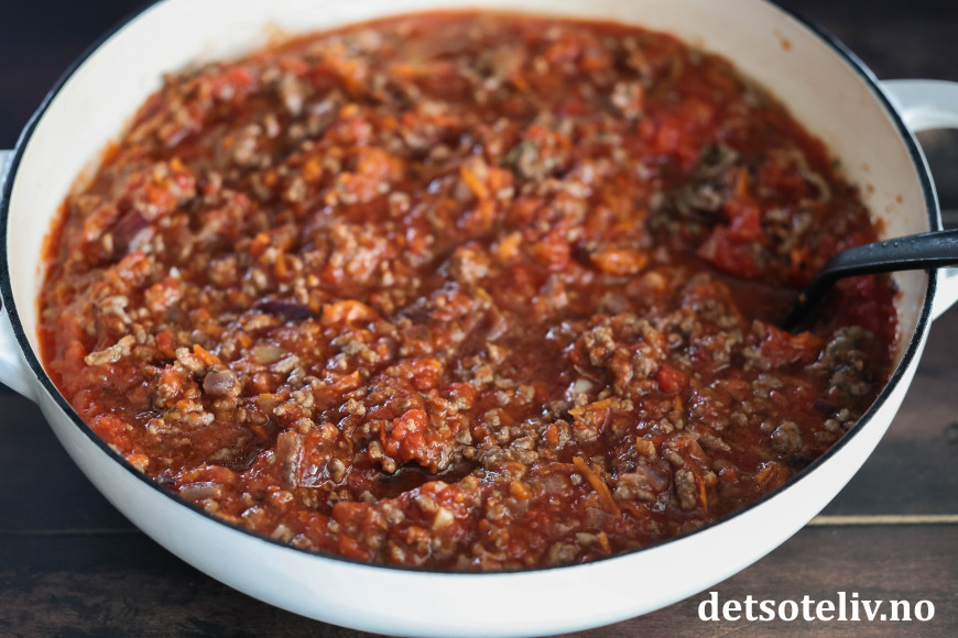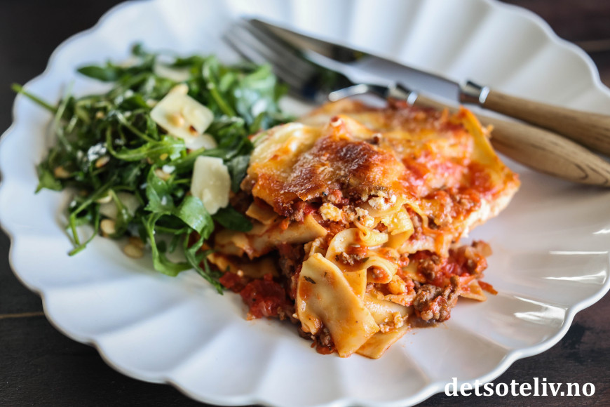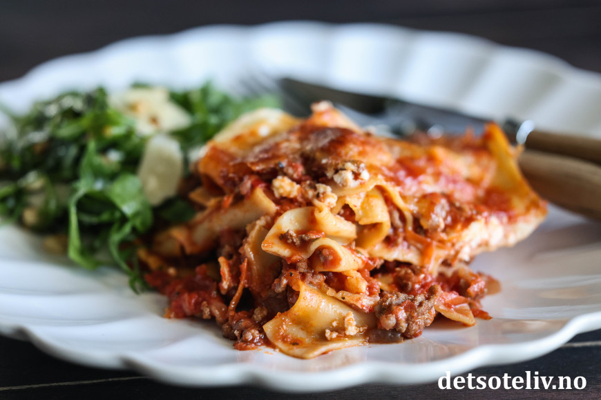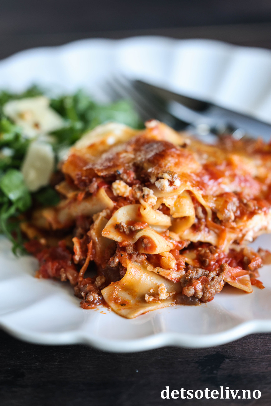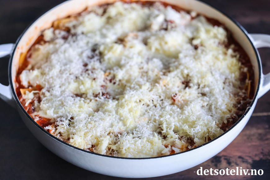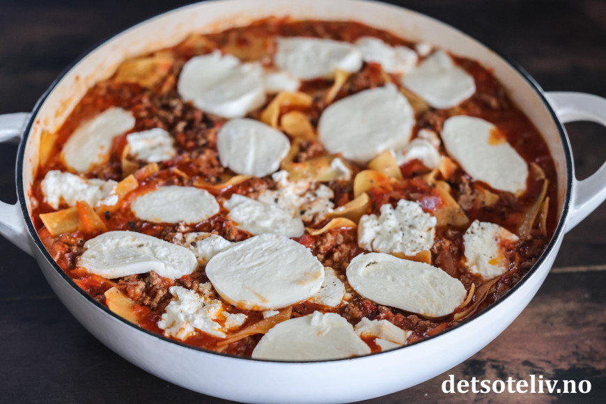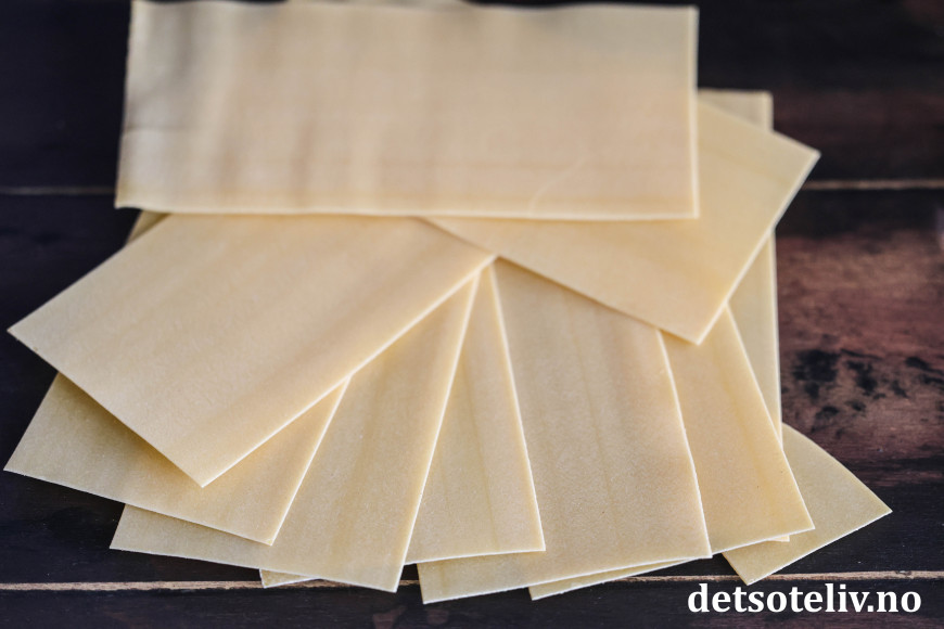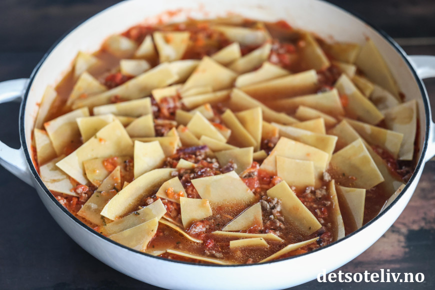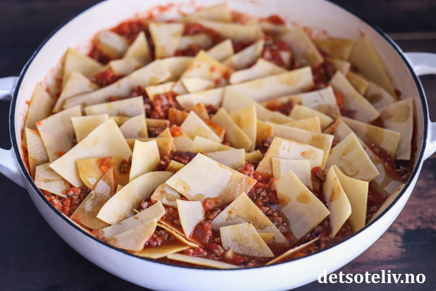 ♥ Jeg liker best å bruke tørre lasagneplater, men det går selvfølgelig fint å bruke fersk pasta også. Jeg lar her de oppbrekkede, tørre pastaplatene småkoke direkte i kjøttsausen for å få dem myke, og synes dette er den enkleste måten. Du kan alternativt koke pastabitene i saltet vann i 3 - 5 minutter for seg selv først, og så blande dem myke inn i kjøttsausen.