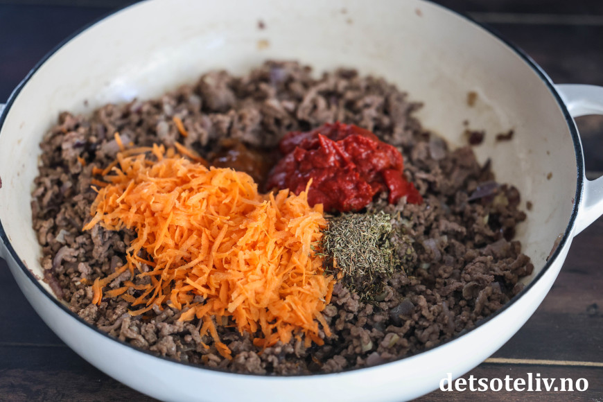 Tilsett finrevet gulrot, tomatpuré og tørkede krydderurter (og eventuelt 1 chef du fond, kjøtt, se tips).