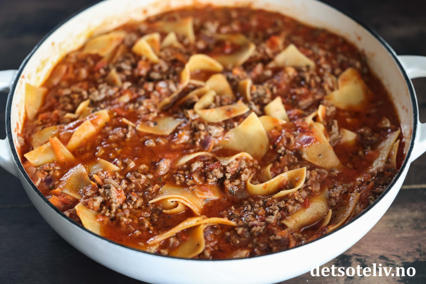 Sett lokk på gryten og gi det hele et oppkok. Senk varmen og la gryten småkoke under lokk i ca. 10 minutter. Rør av og til og dytt pastabitene ned i kjøttsausen etter hvert som de mykner. Etter 10 minutter småkoking under lokk vil alle pastabitene ha blitt myke. Vend om slik at pastabitene blander seg godt med kjøttsausen. Smak til om det trengs litt ekstra kvernet salt og pepper. Ta gryten av platen.