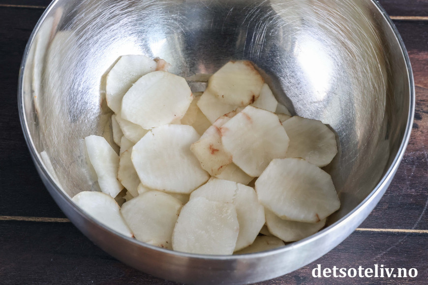 Skrell jordskokkene og skjær i tynne skiver. Dersom du har en mandolin, er denne super å bruke!