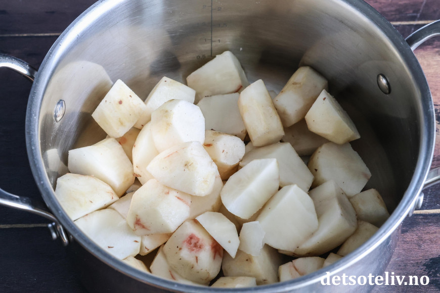 Skrell jordskokkene og skjær dem i mindre biter. Ha bitene i en kjele.