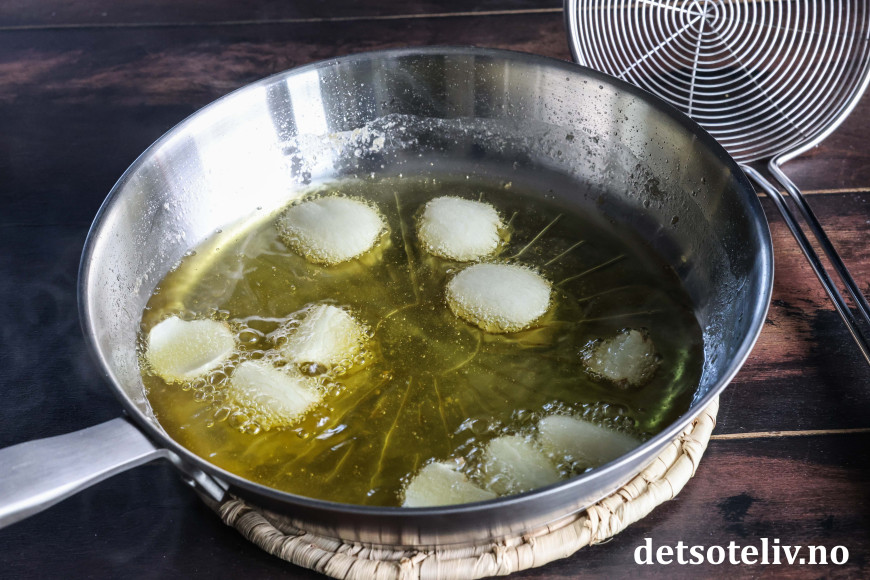 Ha oljen i en liten, dyp stekepanne eller bruk en vid kjele. Varm opp oljen til den blir skikkelig varm. (En test på om oljen er varm nok kan være å ha treskaftet på en sleiv i oljen; da skal oljen være så varm at det bruser rundt treskaftet.)
