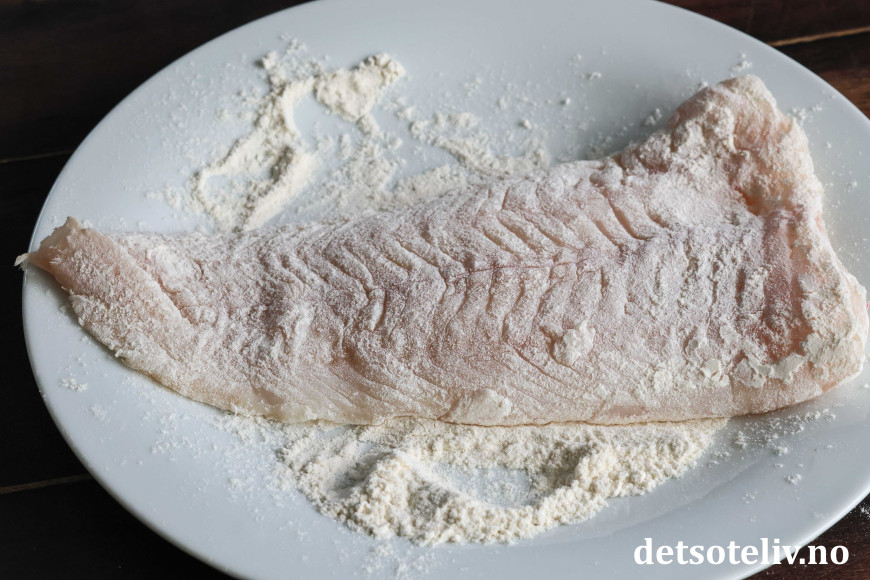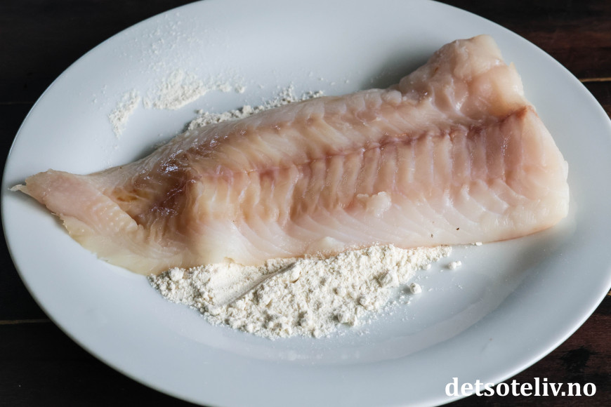 Tørk av fiskefiletene med tørkepapir. Ha hvetemelet på et stor tallerken og kvern over litt salt og pepper. Vend fiskefiletene i hvetemelet på begge sider. Rist vekk overflødig mel.