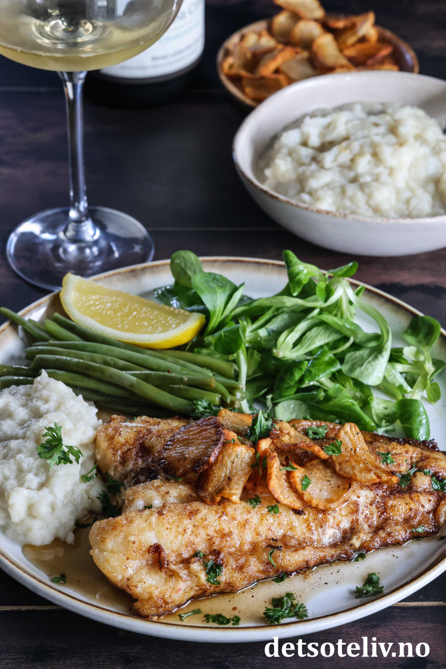 Her serverer jeg brosmefilet i en klassisk fransk smørsaus: sauce meunière, som lages av brunet smør (beurre noisette), sitronsaft og persille. Man kan også tilsette kapers, men det gjorde jeg ikke denne gangen. Som tilbehør lagde jeg en utrolig god Jordskokkpuré og toppet med Jordskokkchips i tillegg til aspargesbønner og en grønn salat.