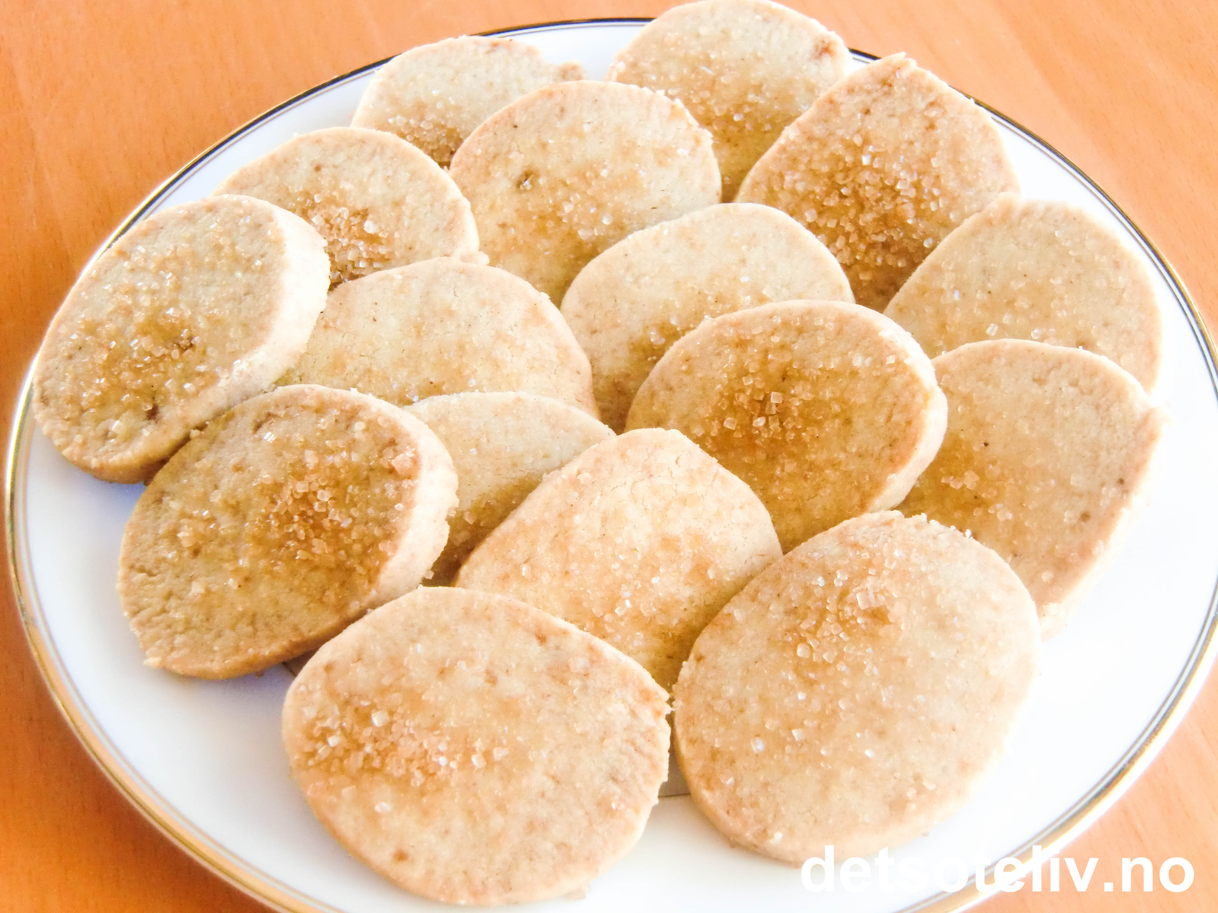 Pisk mykt smør sammen med brunt sukker til smørkrem. Bland sammen de tørre ingrediensene og kna inn i deigen. Form deigen til en rull (ca 5 cm i diameter) som settes kjølig i et par timer.