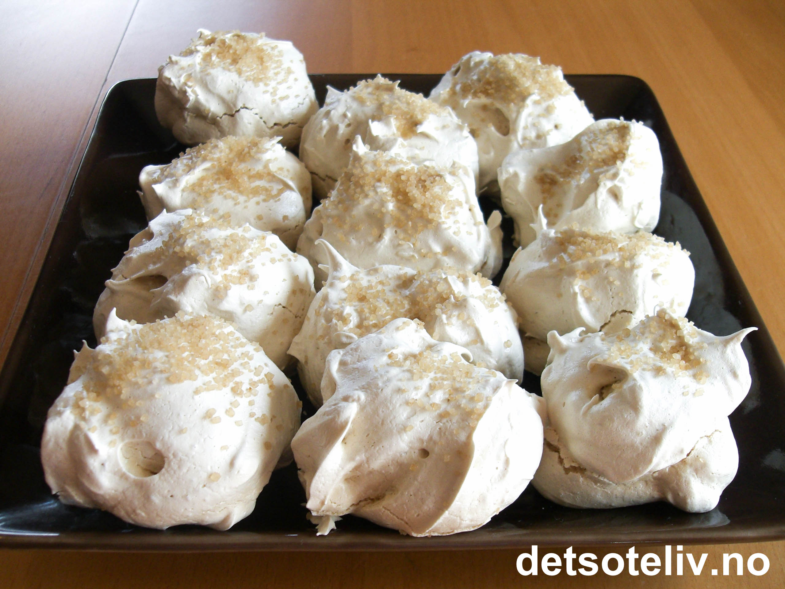 Sett marengstopper ved hjelp av to spiseskjeer på bakepapirdekkede stekeplater. Dryss over litt lysebrunt demerarasukker til pynt.