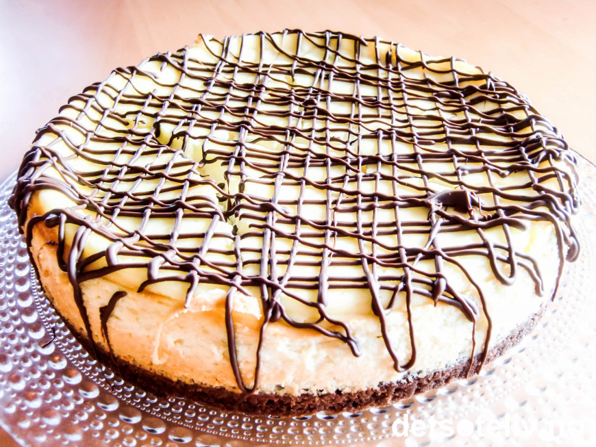 Ta kaken ut av formen og dra bakepapiret av fra undersiden. Sett kaken på et passende fat. Smelt lys kokesjokolade (gjøres raskt i mikro eller over vannbad). Ha sjokoladen i en lite kremmerhus laget av matpapir og ringle sjokoladen over kaken i tynne striper.