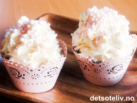 Jeg har her pyntet med masse krem på toppen. Det holder med 3 dl kremfløte hvis du bare vil ha litt krem på hver cupcake.