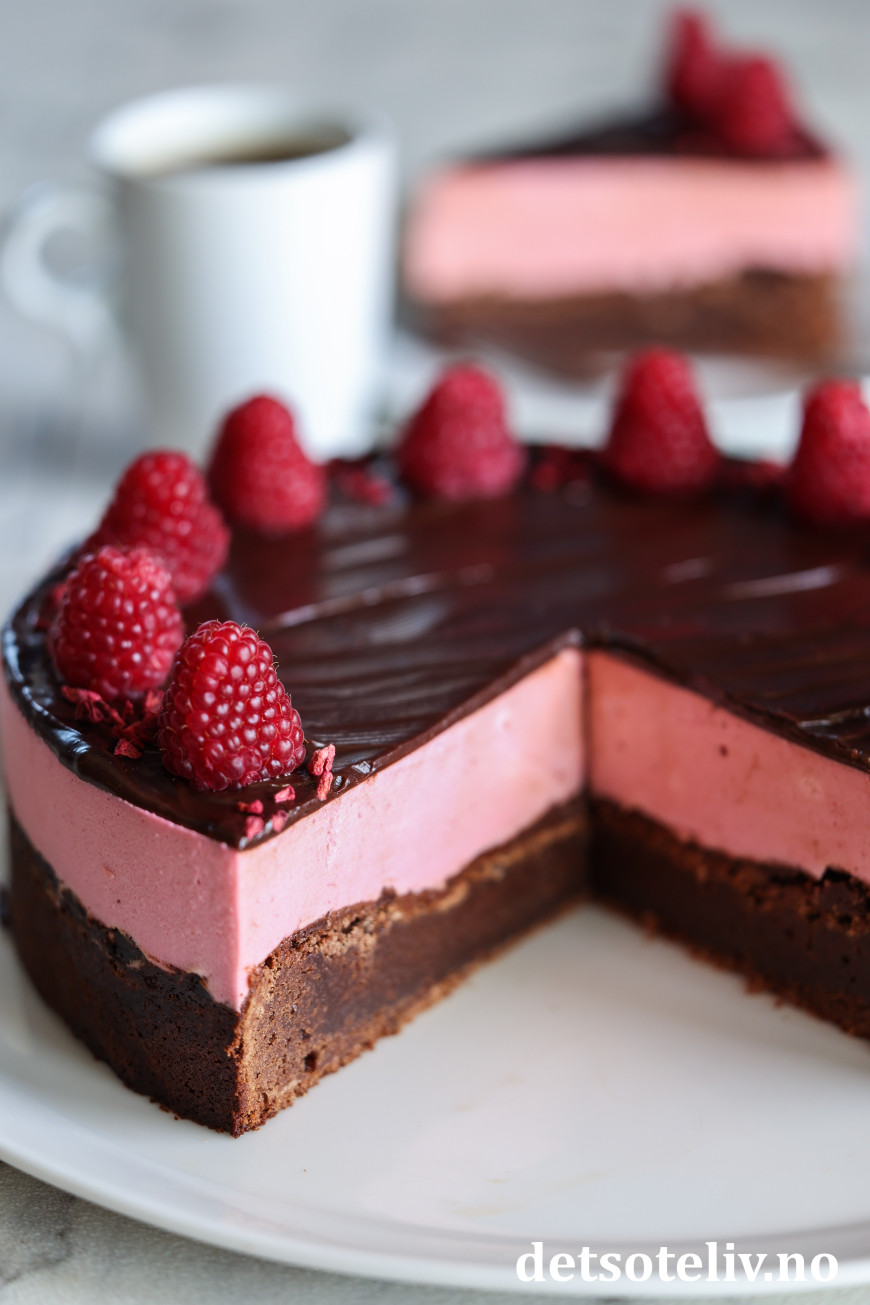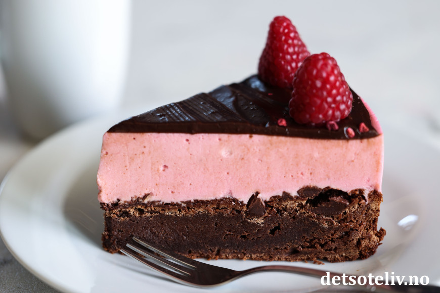 ♥ Som du ser av oppskriften, bør denne browniekaken og bringebærfromasjen lages klar dagen i forveien og stå i kjøleskapet over natten. Da er du helt sikker på at fromasjen har stivnet før du tar kaken ut av formen.