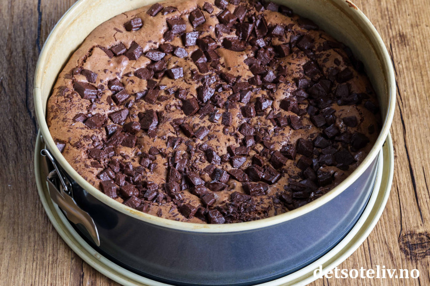 Ha sjokoladedeigen i en rund form (24 cm i diameter) med bakepapir i bunnen. Dryss over 100 gram hakket kokesjokolade.
