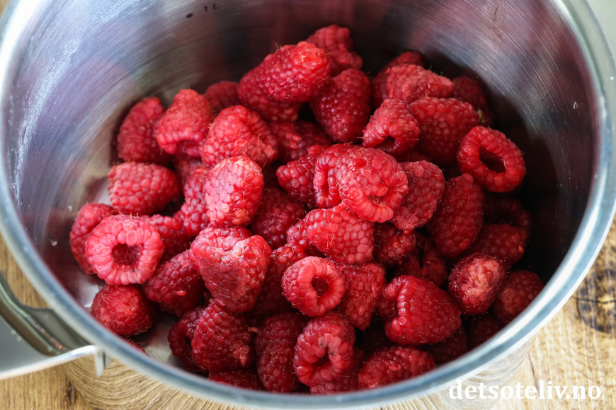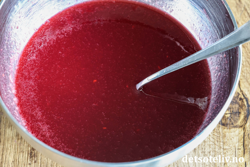 Når bringebærene er oppløst og du har en bringebærsaus, ta kjelen av platen.