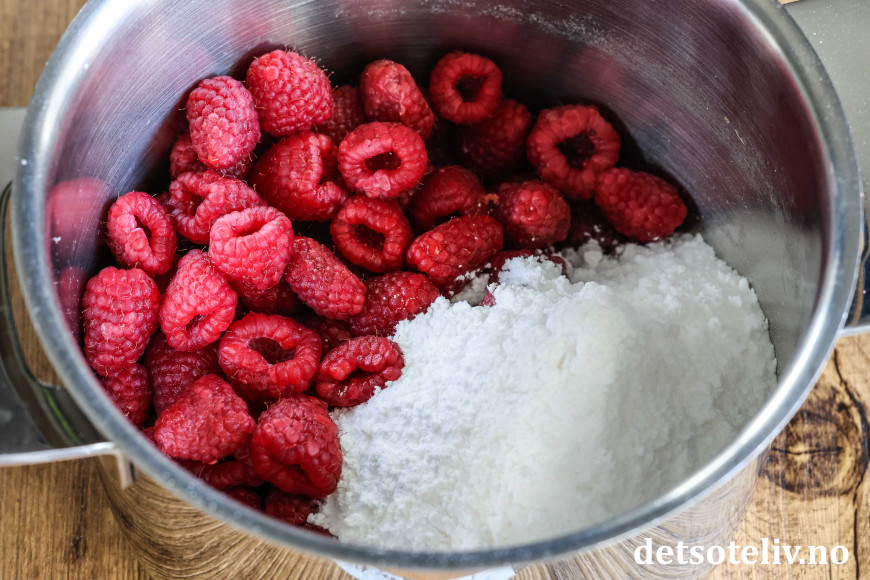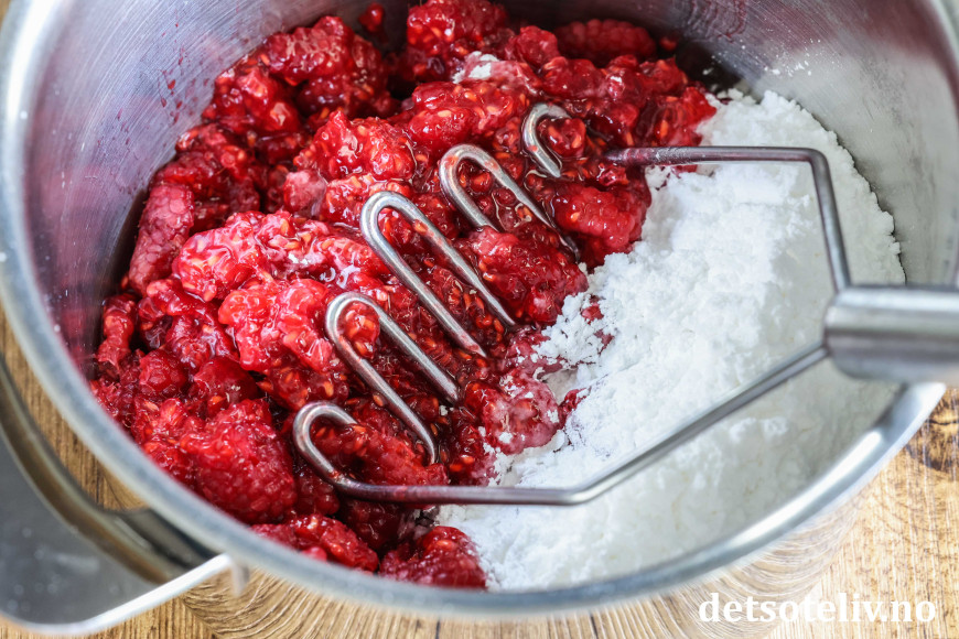 Varm opp blandingen på middels varme mens du moser i bringebærene.