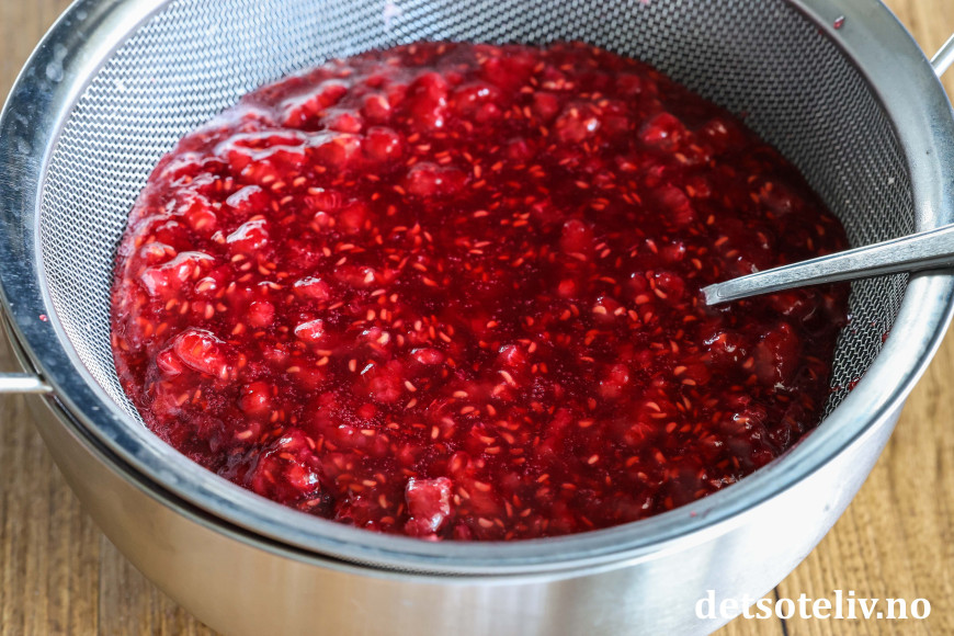 Sil bringebærsausen over i en bolle slik at du får fjernet alle bringebærfrøene. Press godt med baksiden av en skje slik at du får med all den gode bringebærsaften.
