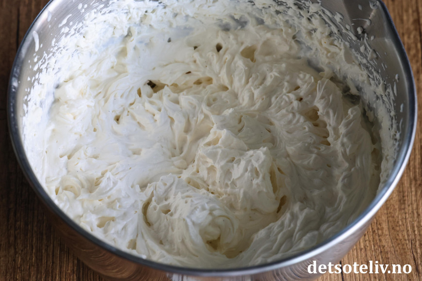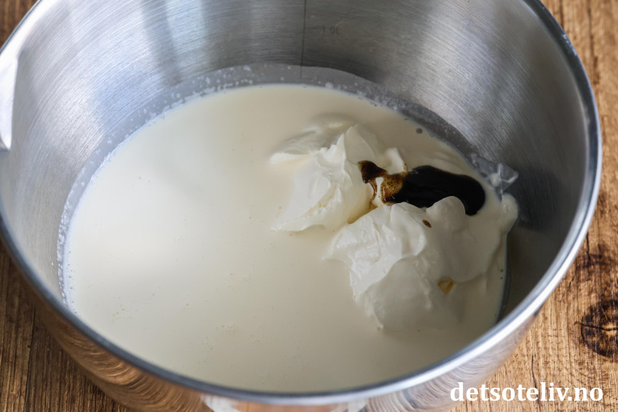 Pisk kremfløte, crème fraîche og vanilje til en tykk krem.