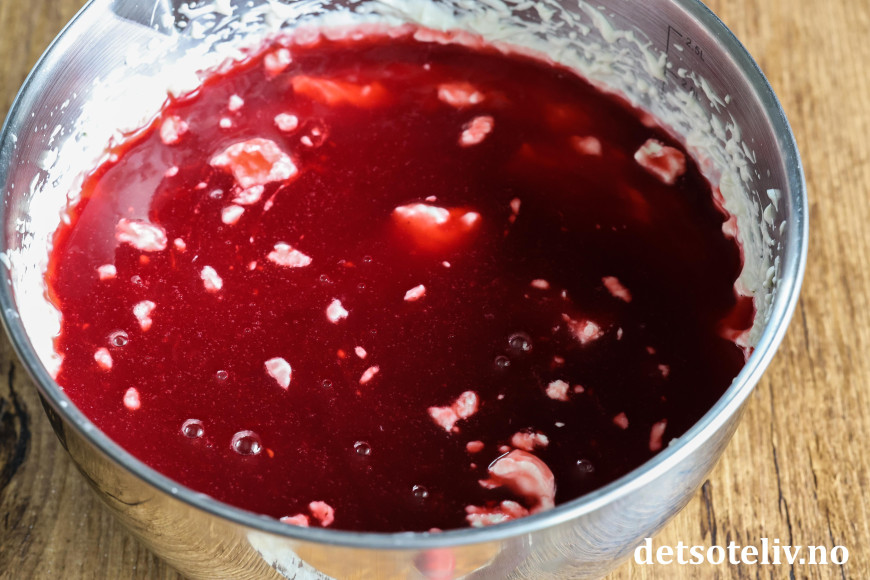 Bland den kalde bringebærsaften inn i kremen, litt om gangen. Pisk med en ballongvisp slik at du får en jevn, rosa krem.