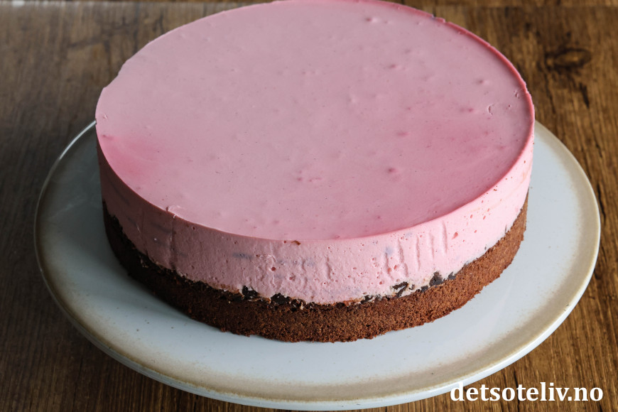 Hell bringebærkremen over browniebunnen i kakeformen. Sett formen i kjøleskapet over natten, slik at fromasjen stivner helt.