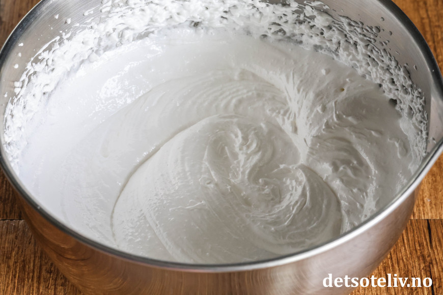 Pisk eggehvitene stive. Tilsett sukkeret og pisk videre til du får en skikkelig tykk og blank marengs.