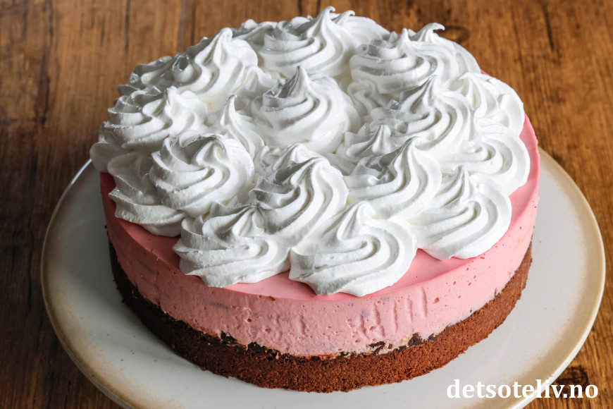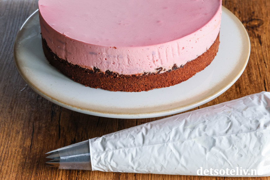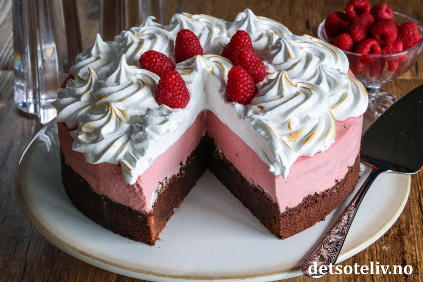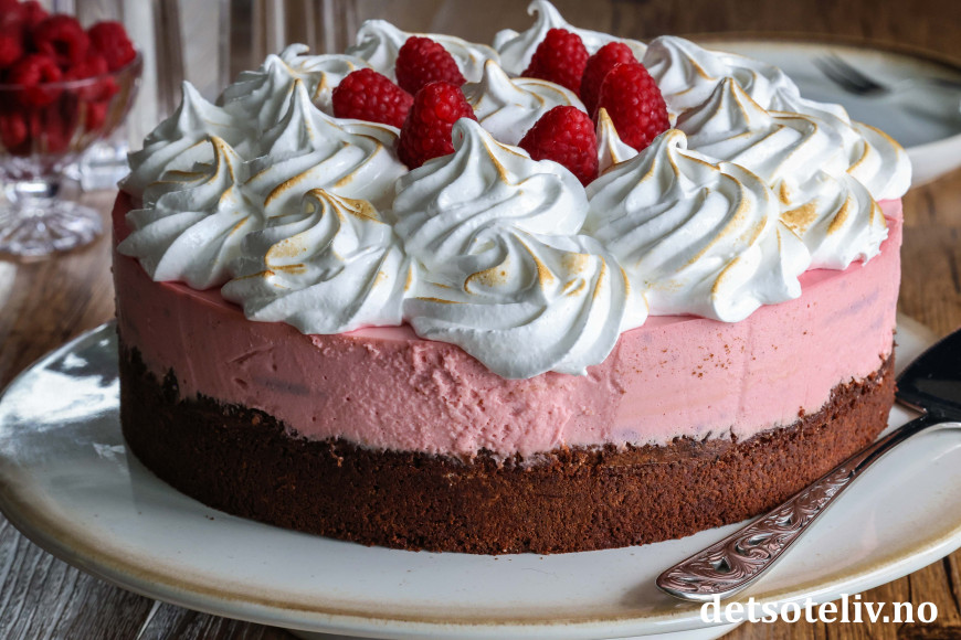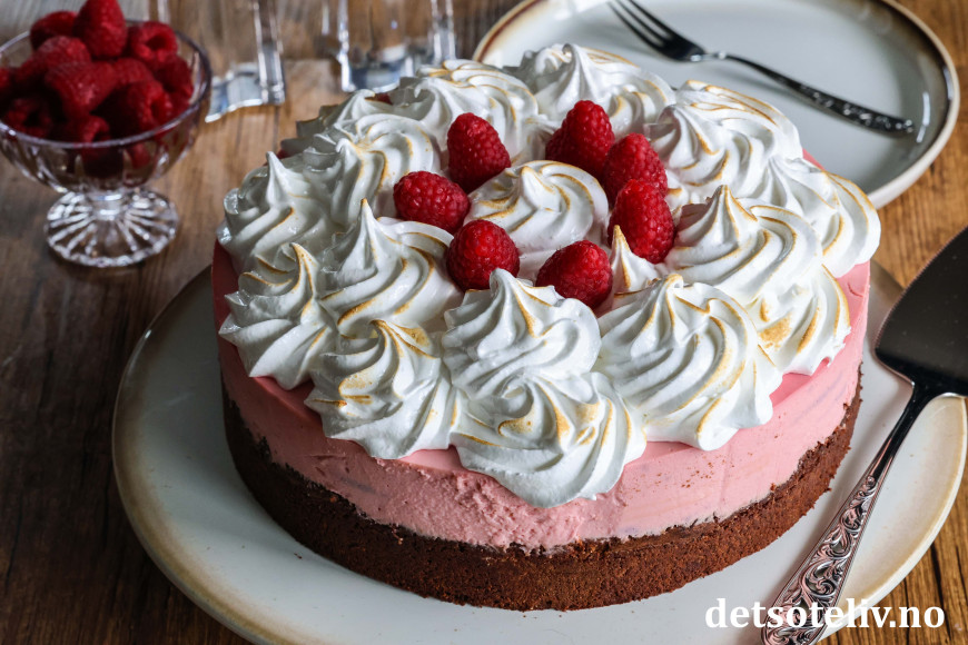♥ Kaken oppbevares i kjøleskapet. Den er best å servere samme dag som den pyntes med marengs og bringebær.