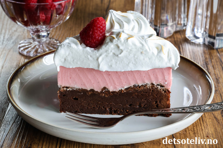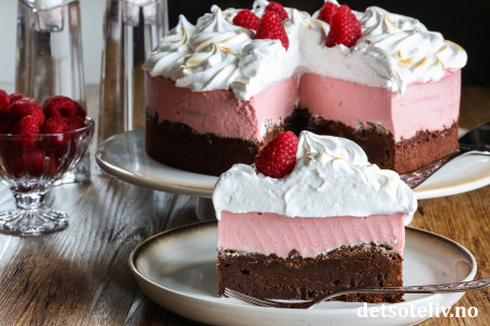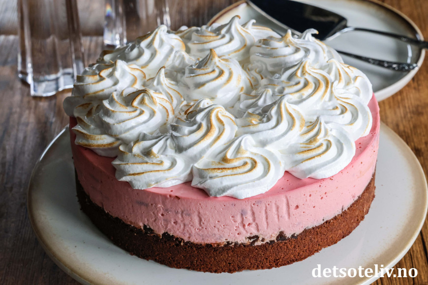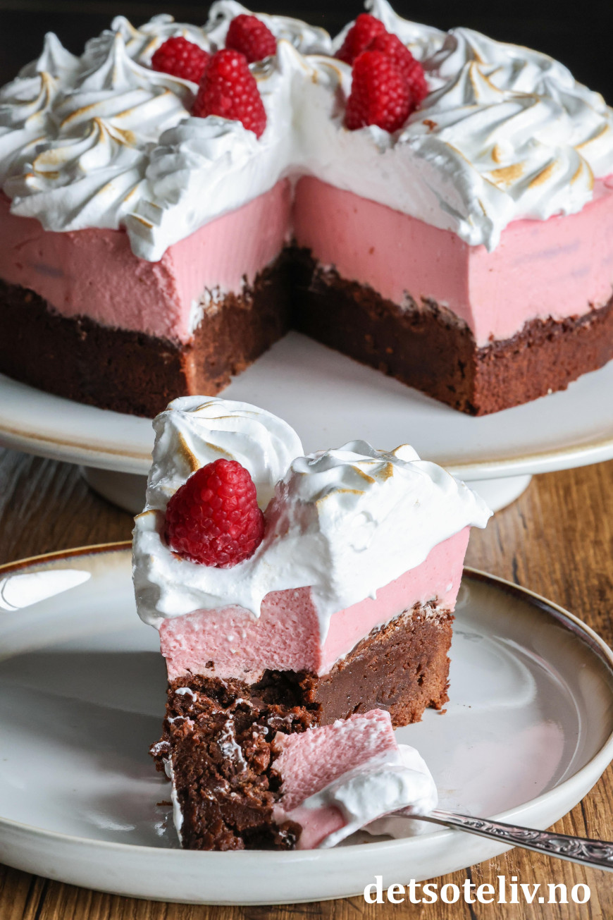 Se også Browniekake med bringebærfromasj, som er samme kake dekket med sjokoladeglasur i stedet for marengs.