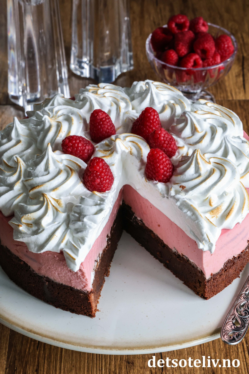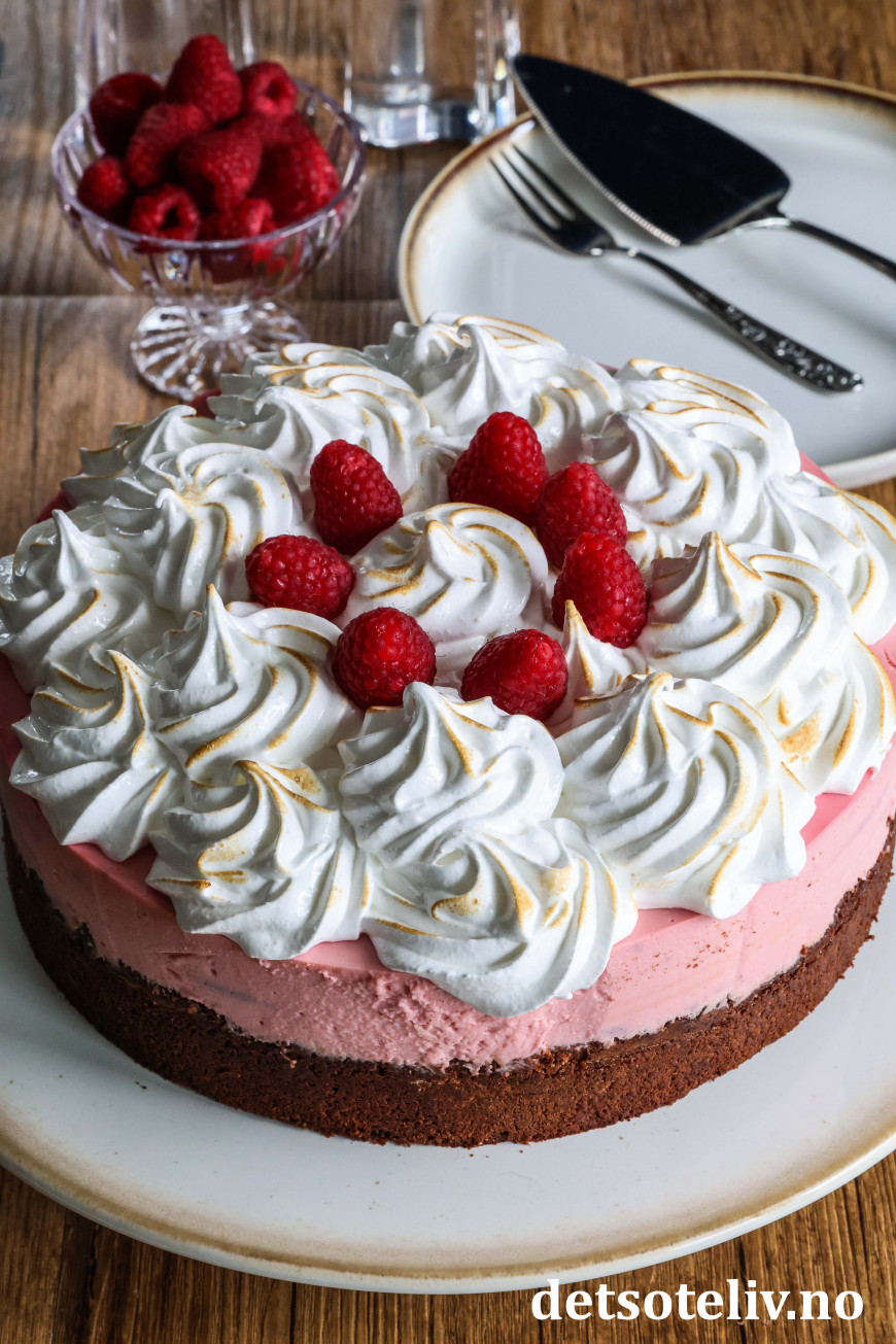 Fargene og den bløte, hvite marengsen mot de røde bringebærene gjør at kaken passer like fint å servere til juleselskapet som til sommerfesten eller 17. mai!
