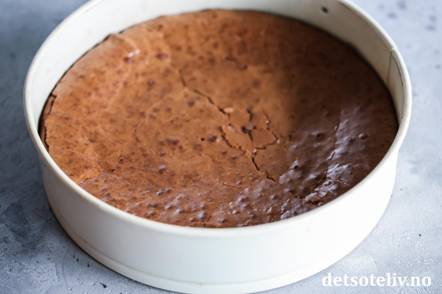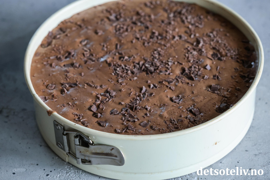 Ha sjokoladedeigen i en stor, rund form (26 cm i diameter) med bakepapir i bunnen.