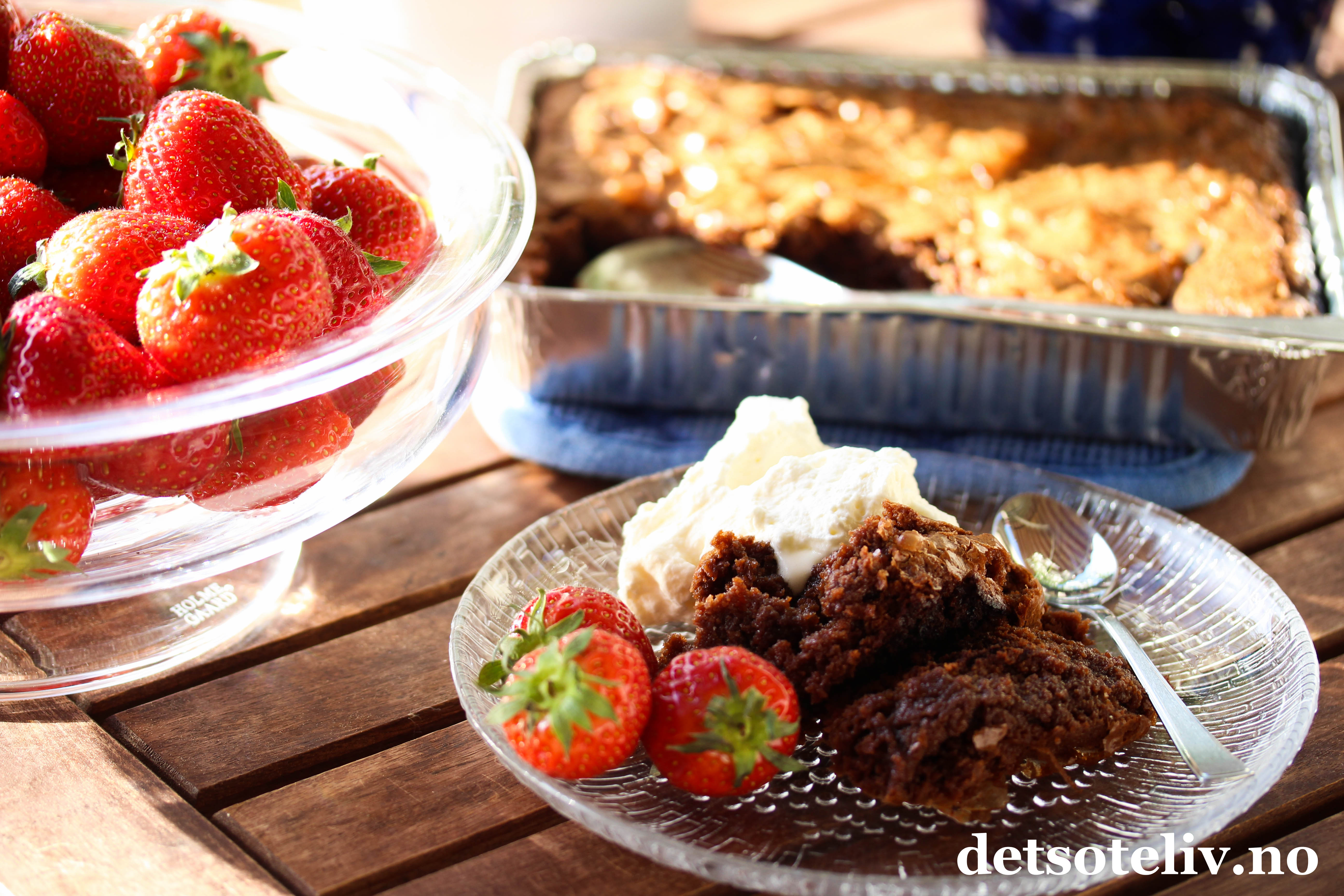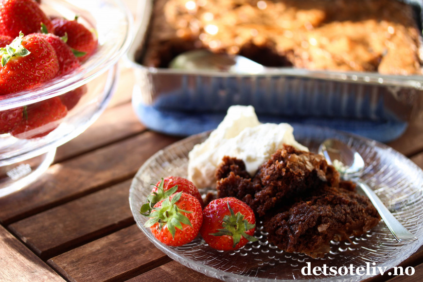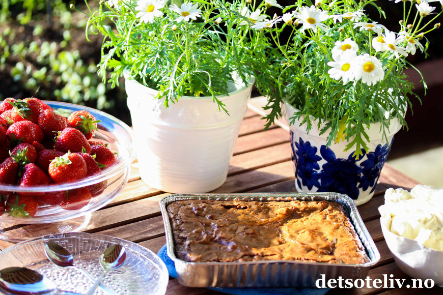 Serveres straks, mens den fortsatt er varm, og gjerne med iskrem og friske jordbær som sommerlig tilbehør.