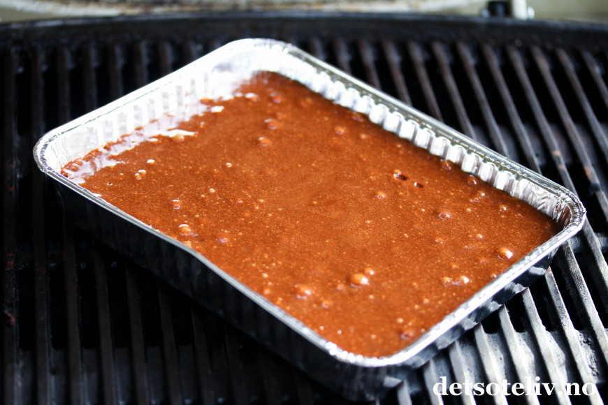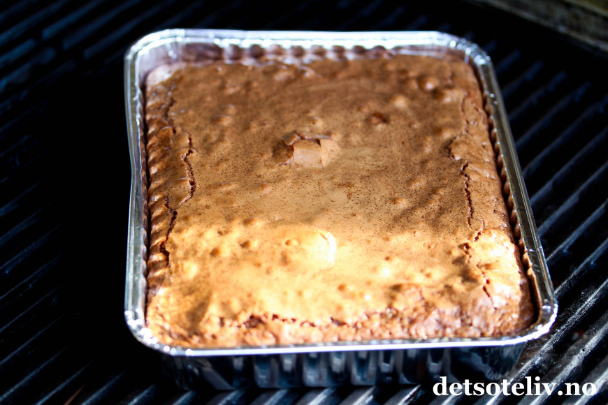 Sett formen på grillen (se tips). Stek kaken i ca 20-25 minutter, til den virker nesten gjennomstekt, men fortsatt litt bløt i midten.