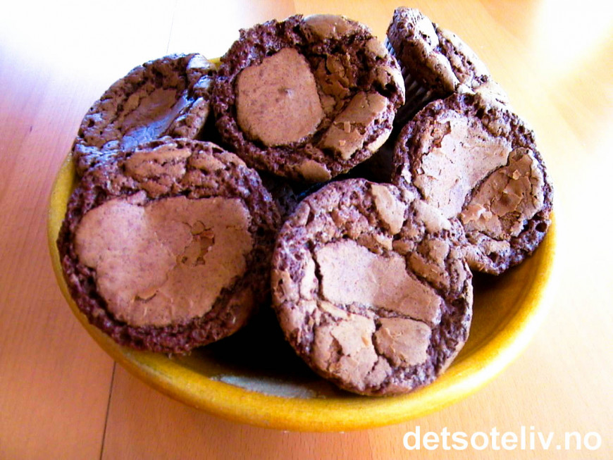 "Browniemuffins" er FANTASTISK HERLIGE muffins!!! Muffinsene får en litt seig konsistens og en myk og litt klebrig kjerne. Sjokoladesmaken er nydelig!!! I tillegg er de svært raske å lage:-)