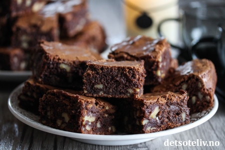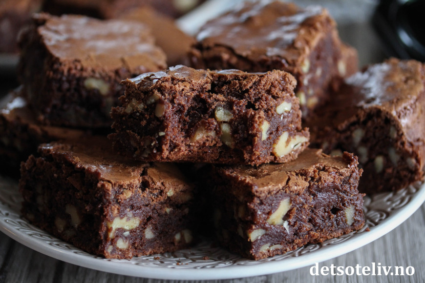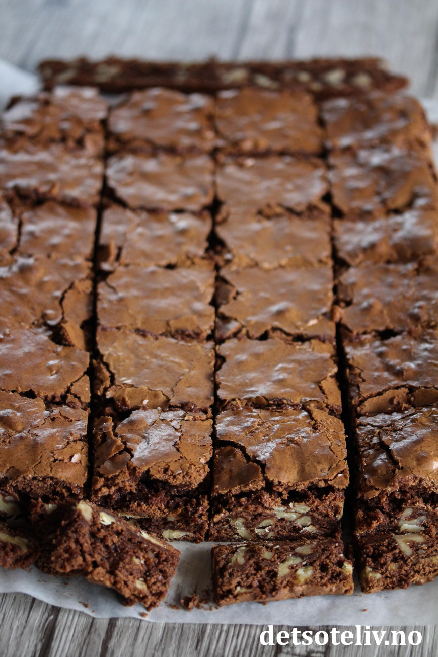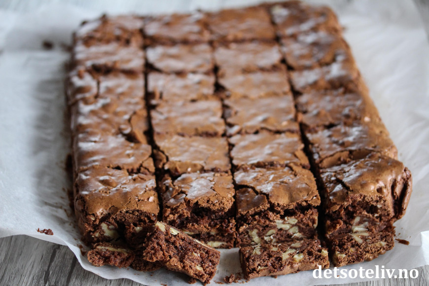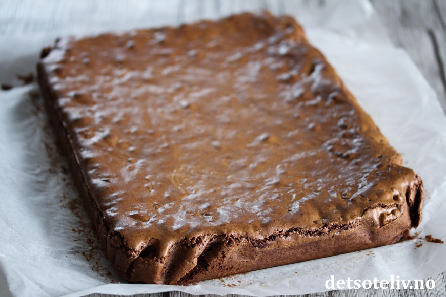♥ Det er viktig å ikke steke kaken for lenge. Den vil ikke virke gjennomstekt når steketiden er over. Kaken skal være fast på toppen og ha en flytende kjerne. Siden kaken er så bløt når den tas ut av ovnen, er det viktig at den må bli helt kald i langpannen før du tar den ut. Sett kaken gjerne i kjøleskapet over natten. Det er mye smør og sjokolade i oppskriften, og dette stivner når kaken blir helt kald slik at kaken lar seg løfte ut av formen uten at den går i stykker. Vil du ha bløt konsistens på kakene når du spiser dem, er det bare å la stykkene stå i romtemperatur i et par timer (eventuelt ha kakene noen sekunder i mikroen).