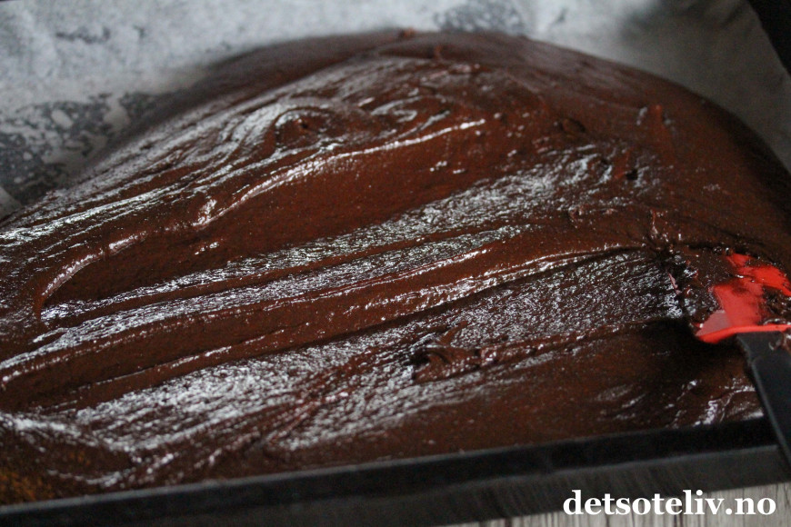 Fordel deigen jevnt utover i en stor langpanne (ca 30 x 40 cm) med bakepapir i bunnen.