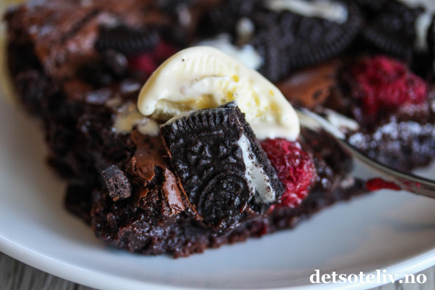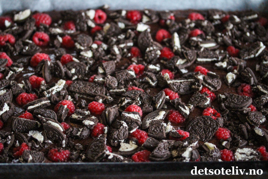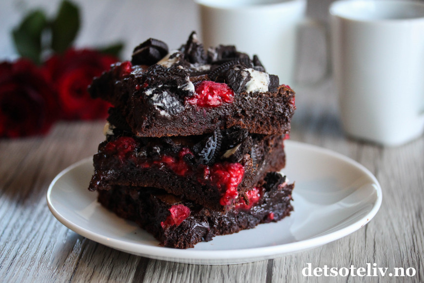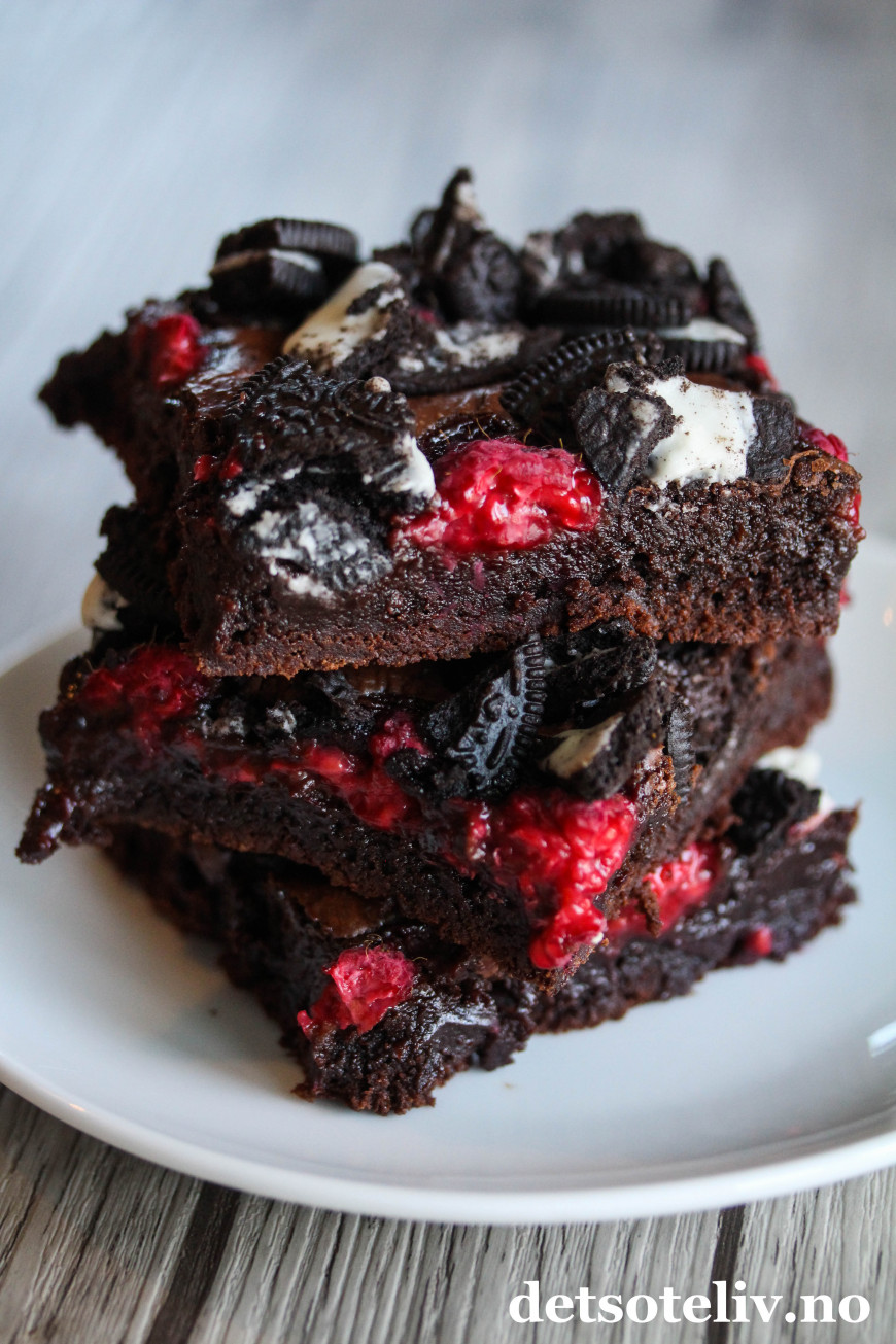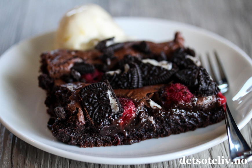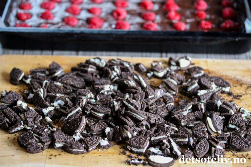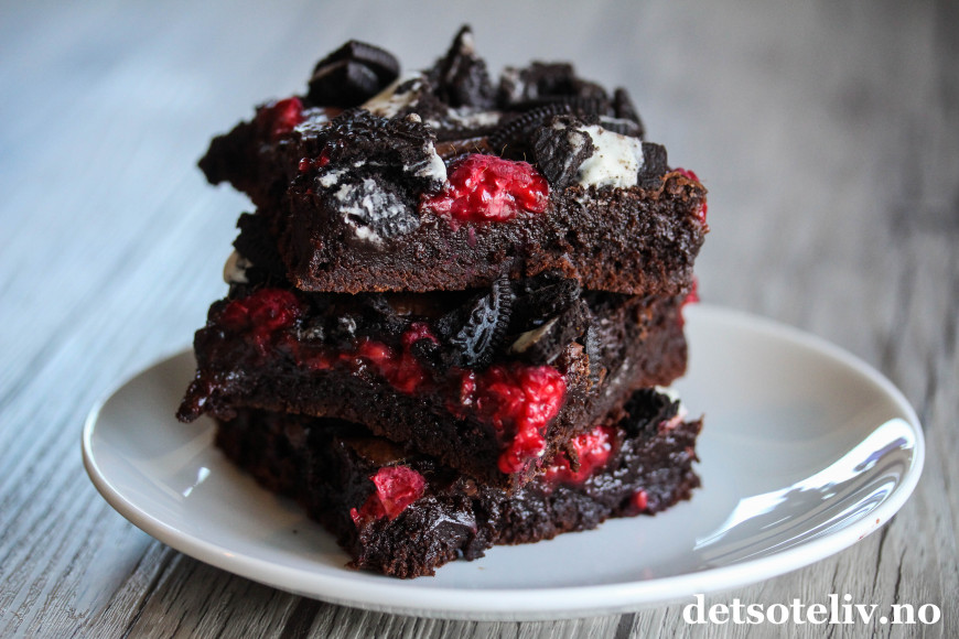Imens kan du kose deg med bløt, sommerlig brownies med bringebær og Oreo!