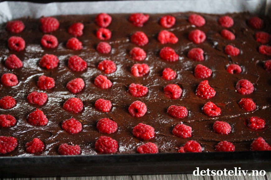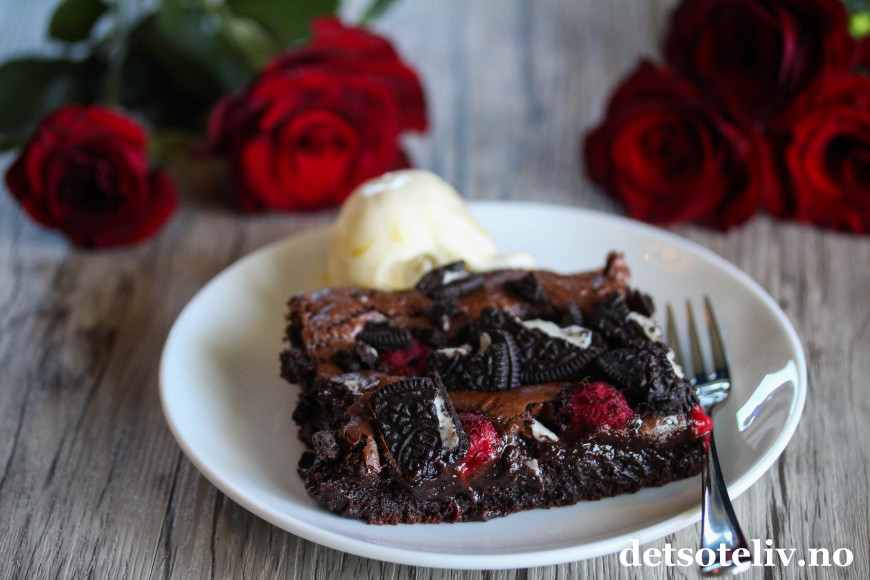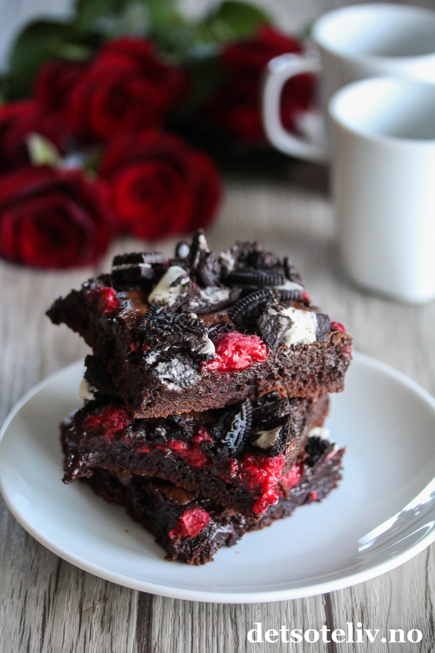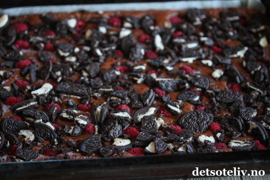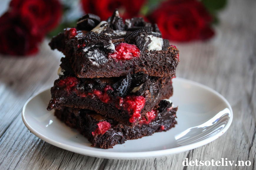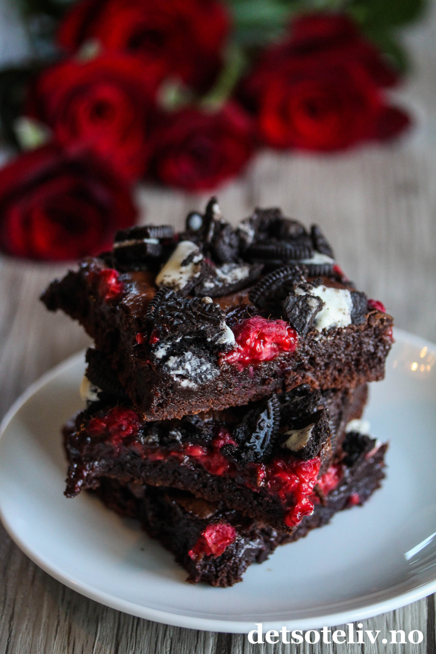 Imens kan du kose deg med bløt, sommerlig brownies med bringebær og Oreo!