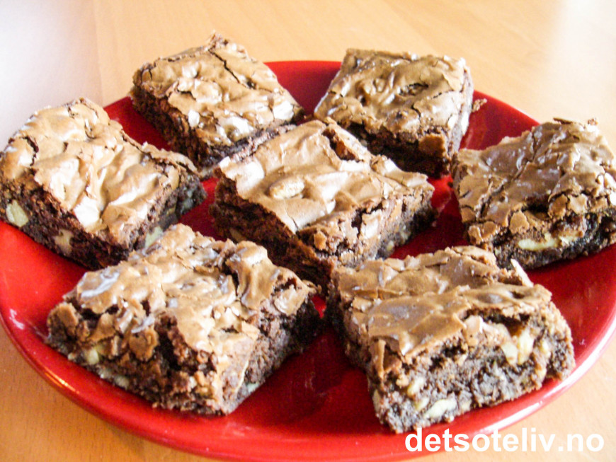 Smelt smøret i en liten kjele. Ha i brunt sukker og kokesjokoladen oppdelt i biter. Rør til alt er smeltet. Avkjøl til blandingen er lunken. Pisk inn eggene med en ballongvisp. Bland så inn hvetemel som er siktet sammen med bakepulver. Til slutt tilsettes hakkede dadler og valnøtter.