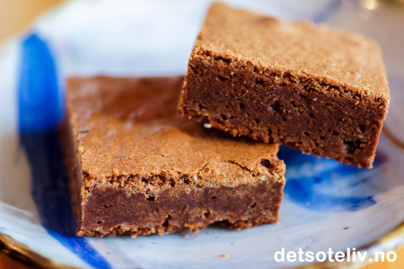 Hell deigen i en stor, bakepapirkledd langpanne (ca 30x40 cm). Stek kaken midt i ovnen ved 180°C i 25 min. Avkjøl kaken helt i formen. Hvelv kaken ut av formen og fjern bakepapiret. Del opp i firkanter.