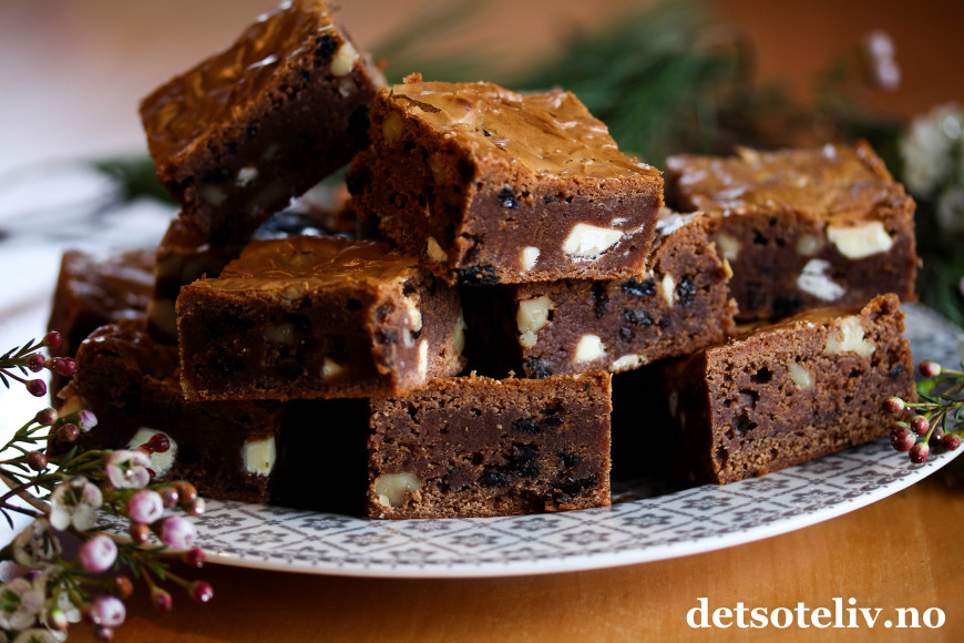 Pisk egg og sukker lett sammen med en stålvisp (det er ikke nødvendig å piske eggedosis). Rør i sjokoladesmøret. Sikt i mel, bakepulver og krydder. Bland i korinter og hakket hvit sjokolade og eventuelt hakkede valnøtter.