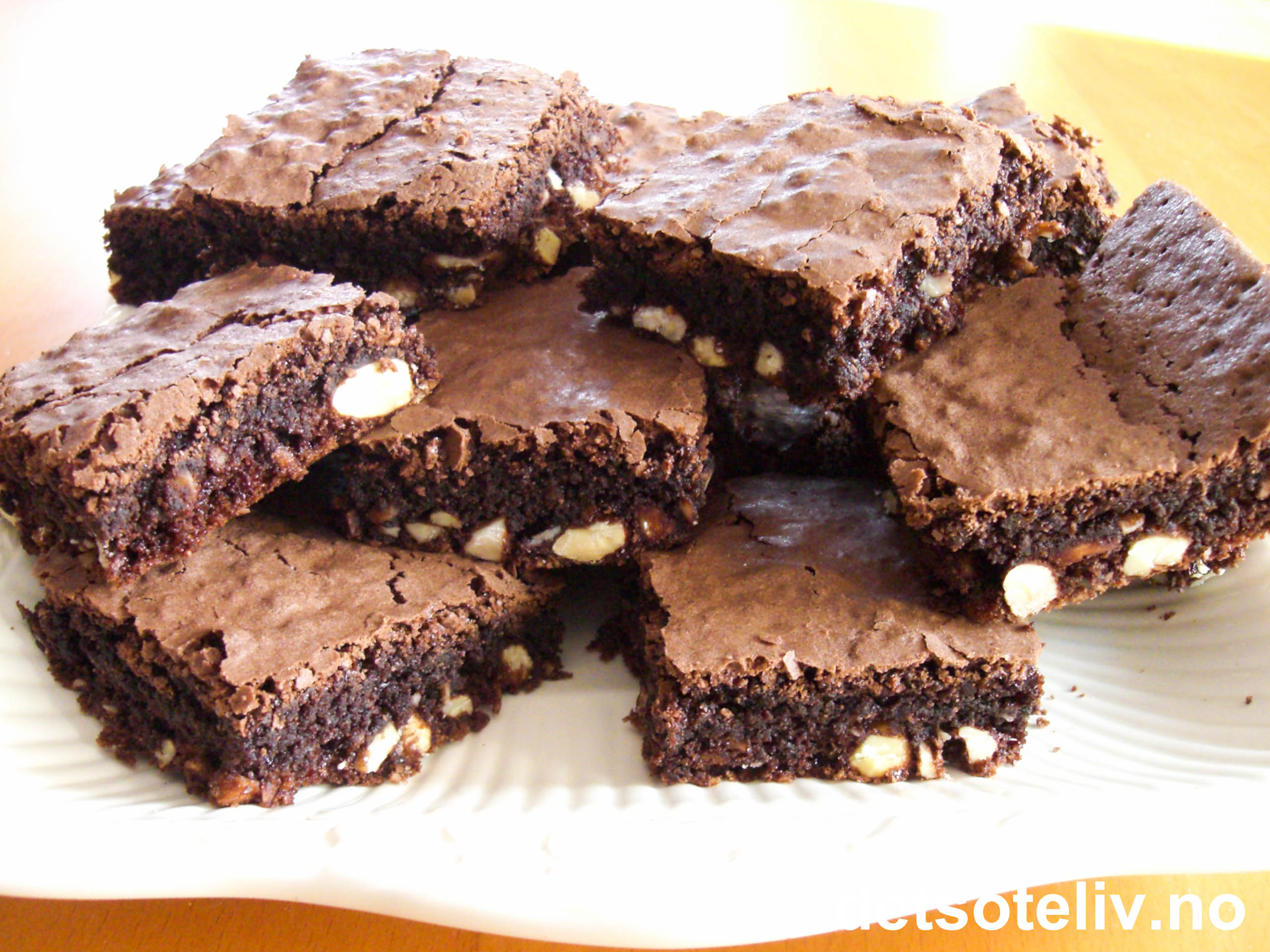 Pisk sammen egg og sukker med en stålvisp i en stor bakebolle (det er ikke nødvendig å piske eggedosis). Smelt smøret. Bland kakao med smøret til den har løst seg opp. Avkjøl noe og rør dette deretter i eggedosisen. Sikt sammen hvetemel, vaniljesukker og bakepulver og bland inn i deigen. Rør med stålvisp til deigen er klumpfri. Tilsett til slutt grovt hakkede mandler (gjøres raskt i food processor).