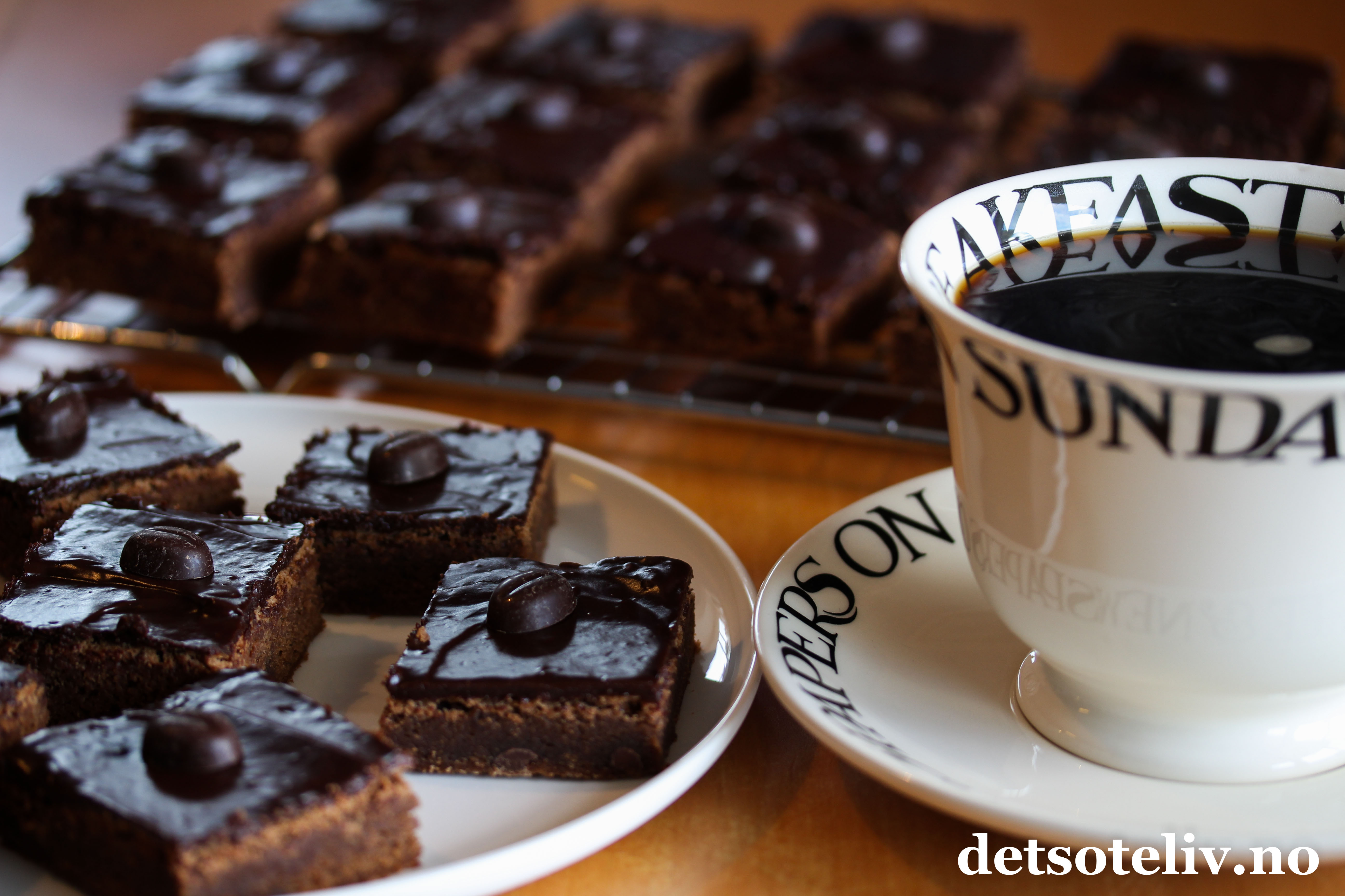"Brownies med mokkabønner" har DEILIG smak av sjokolade og kaffe. Jeg har brukt mokkabønner i tillegg til kokesjokolade i både kake, glasur og som pynt.