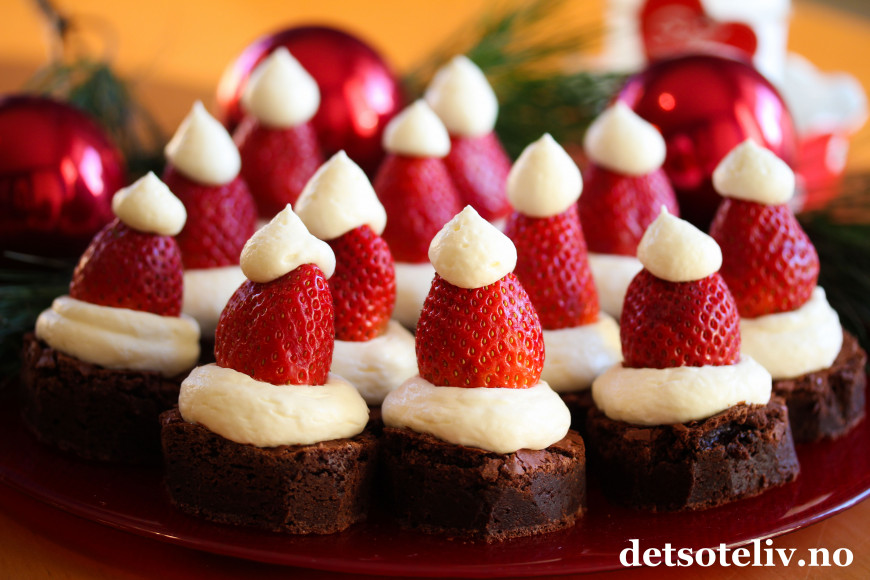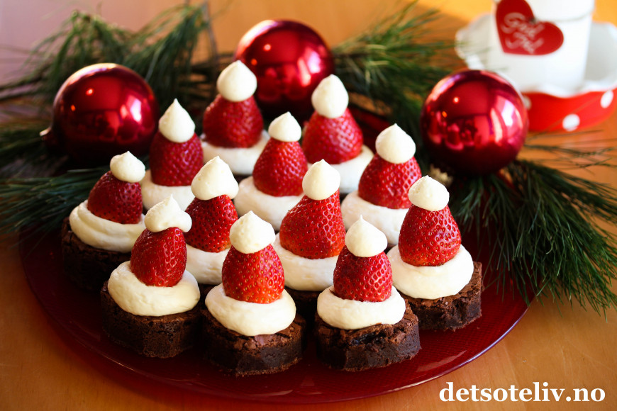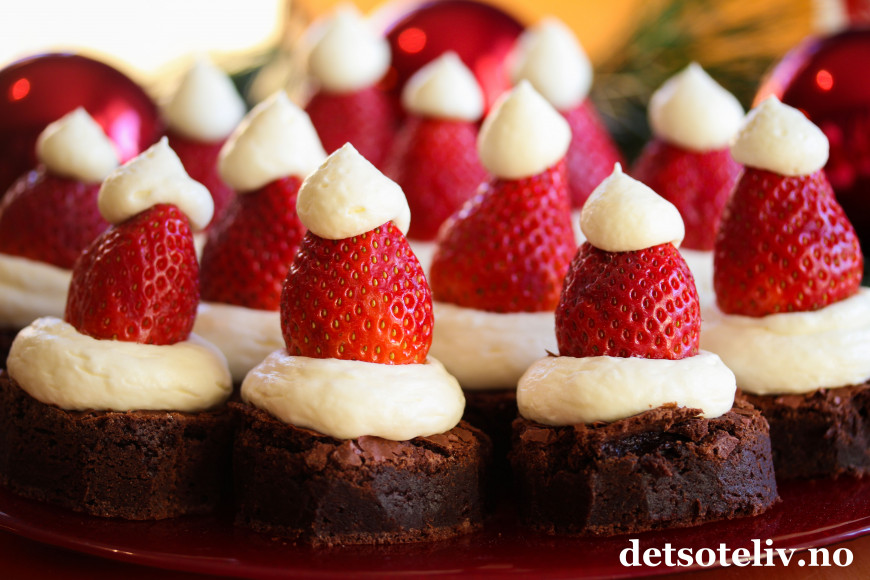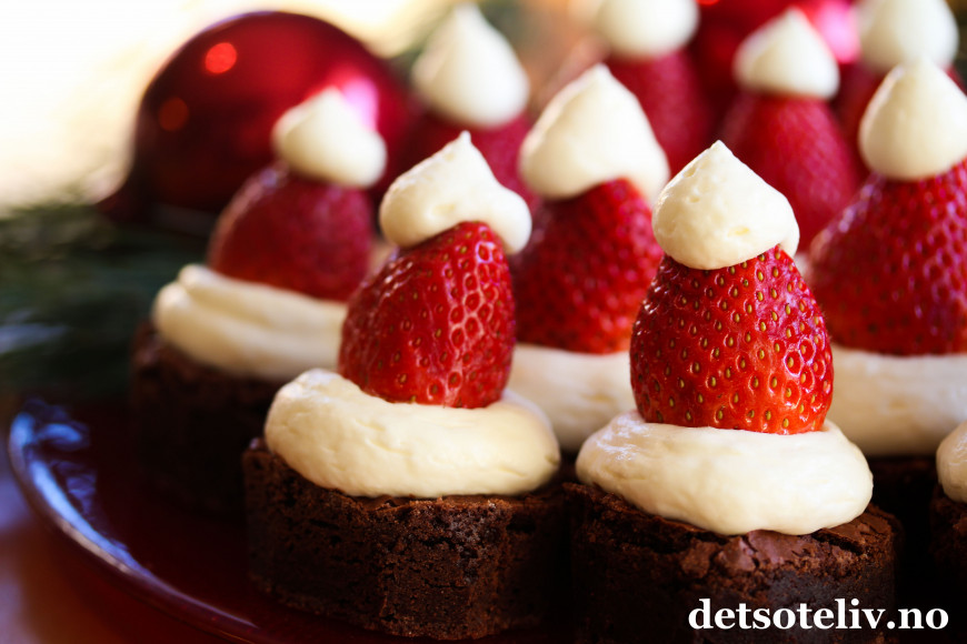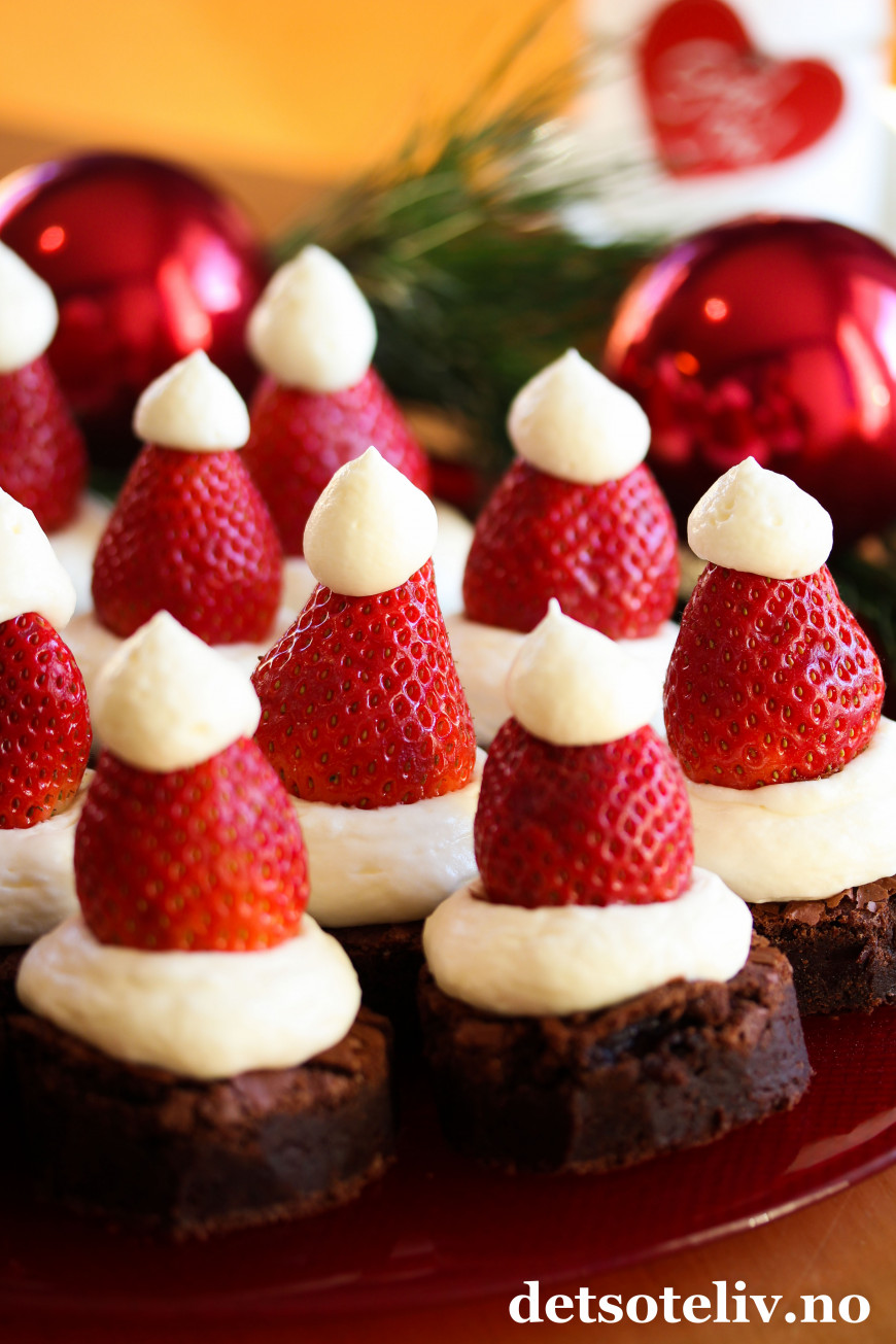 Dette er en artig måte å pynte konfektaktige sjokoladebrownies på. Nisseluer laget av jordbær og ostekrem gir god smak og søt julestemning.