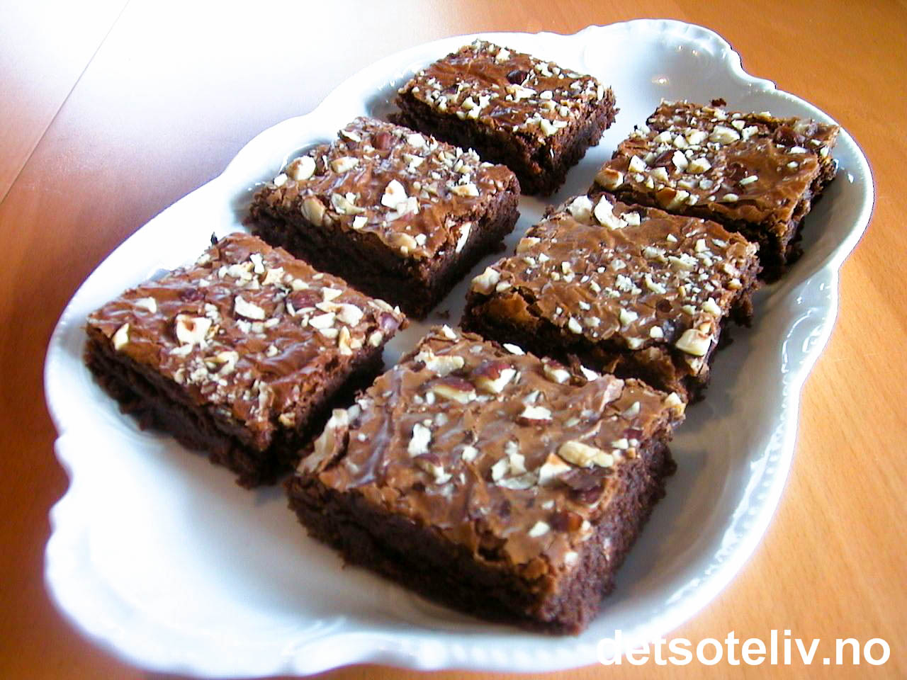 Hell deigen i en stor, bakepapirkledd langpanne (ca 30x40 cm). Dryss over fint hakkede hasselnøtter. Stek kaken midt i ovnen ved 175°C i 30-35 min. Avkjøl kaken helt i formen. Hvelv kaken ut av formen og fjern bakepapiret. Del kaken i firkanter.