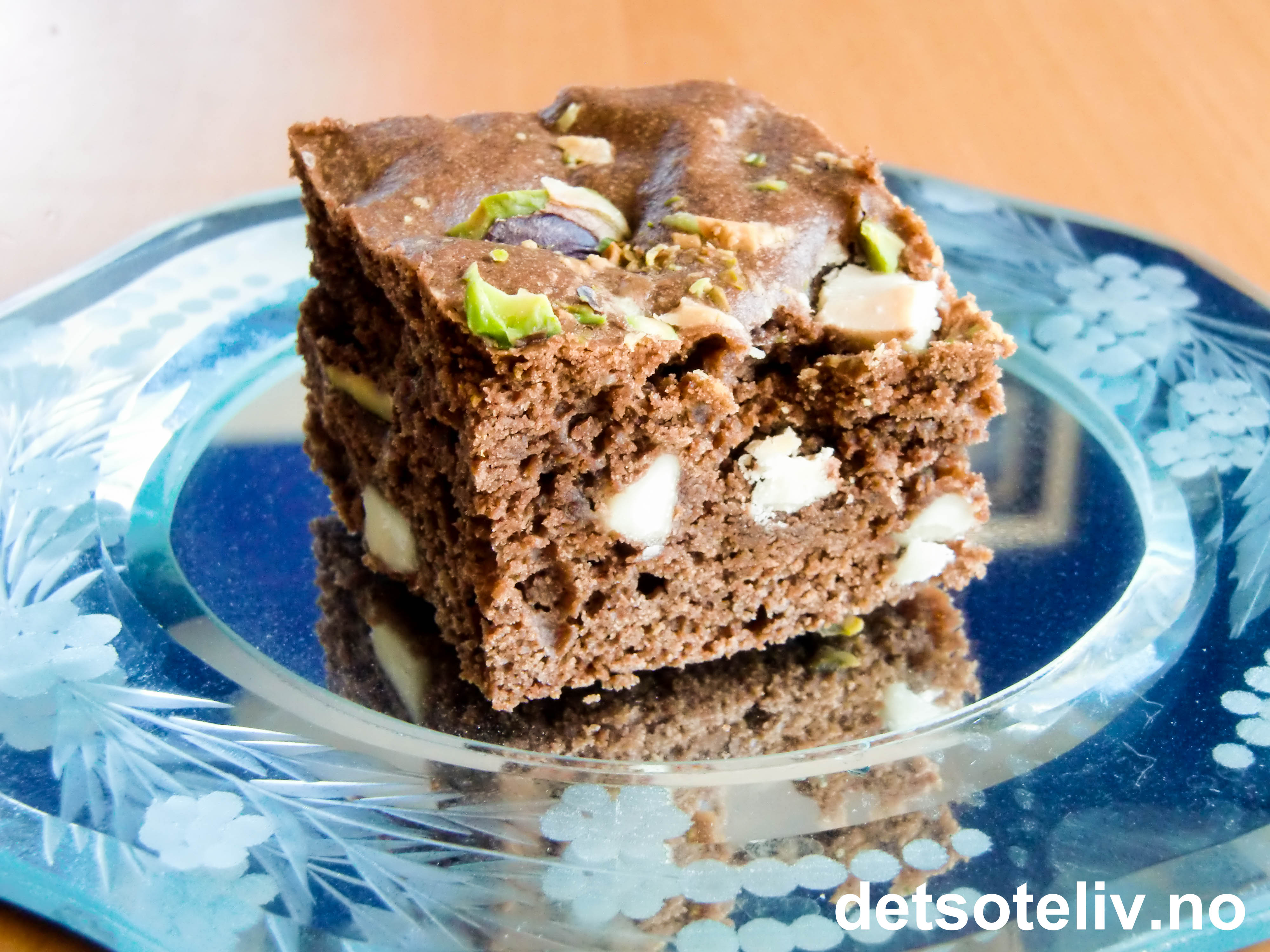 Ha deigen i en liten, bakepapirkledd langpanne (ca 20x30 cm). Dryss over resten av de hakkede pistasjnøttene og hvite sjokoladen.