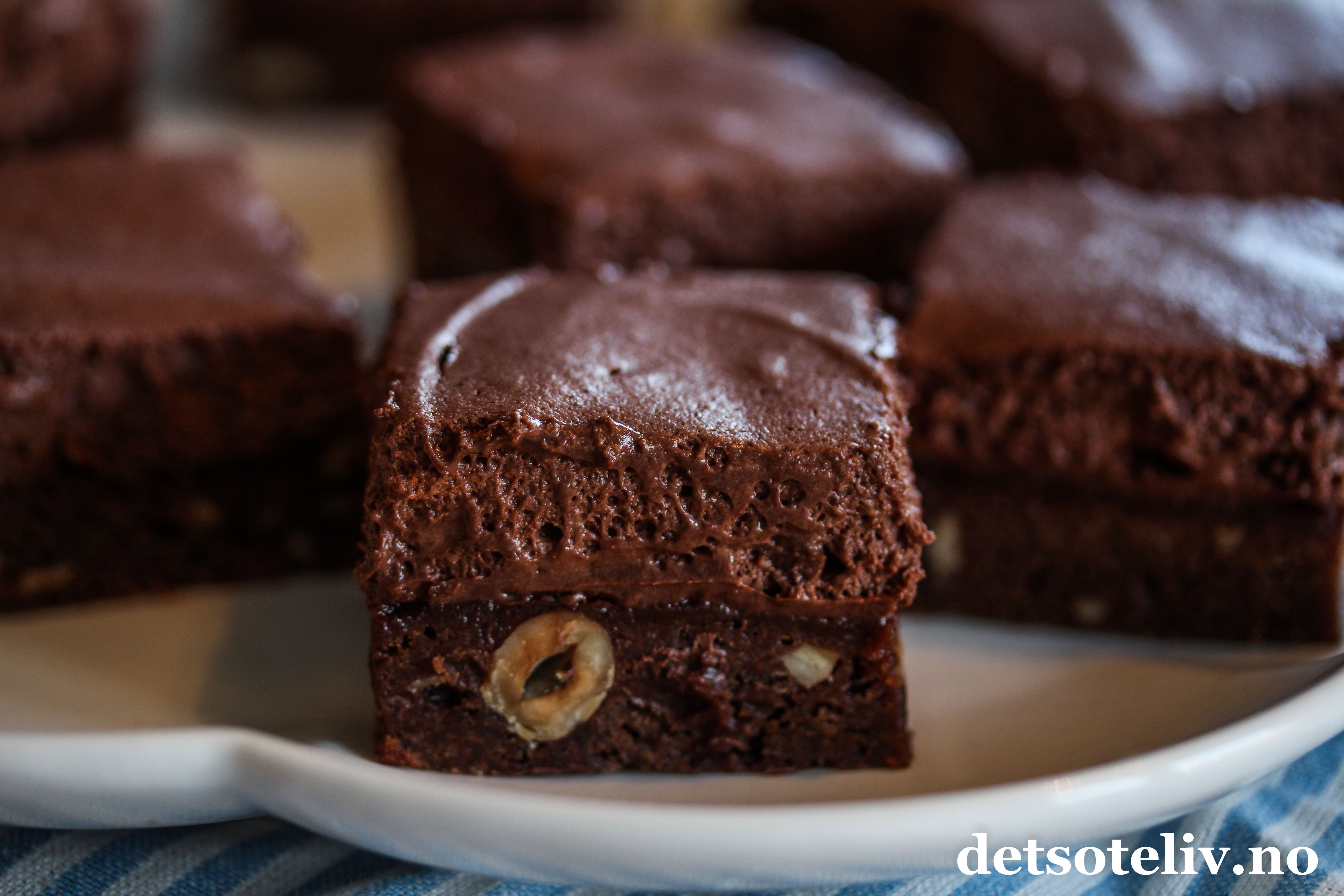 Smelt smør og sjokolade sammen i en kjele på svak varme. Avkjøl. Pisk sammen egg og sukker med en stålvisp. Visp inn sjokoladesmøret. Rør deretter inn vaniljesukker og hvetemel. Bland i hakkede nøtter til slutt (nøttene kan sløyfes).