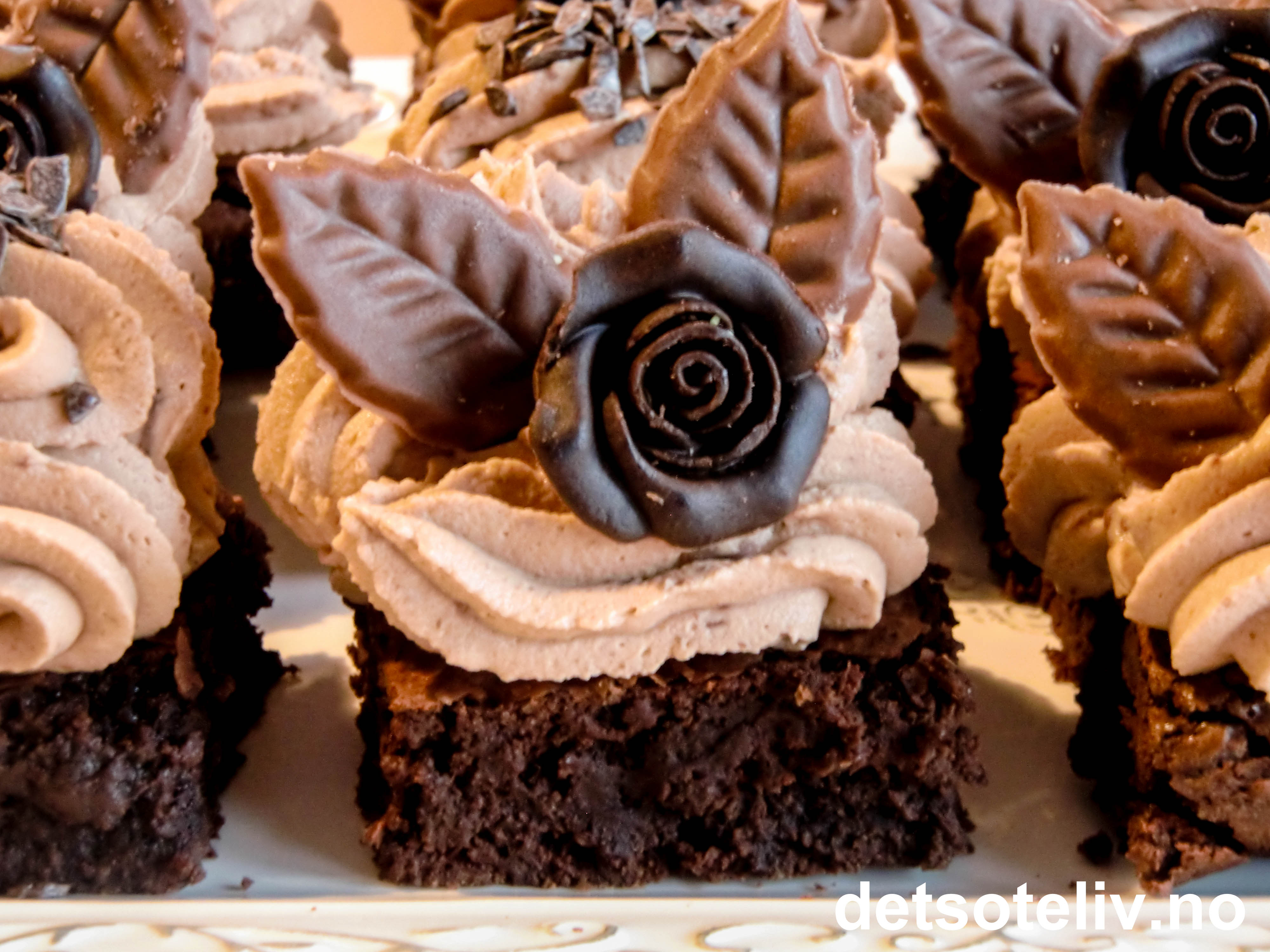 Litt luftig sjokoladekrem gjør seg utrolig godt på toppen av fuktige, mektige sjokoladebrownies!