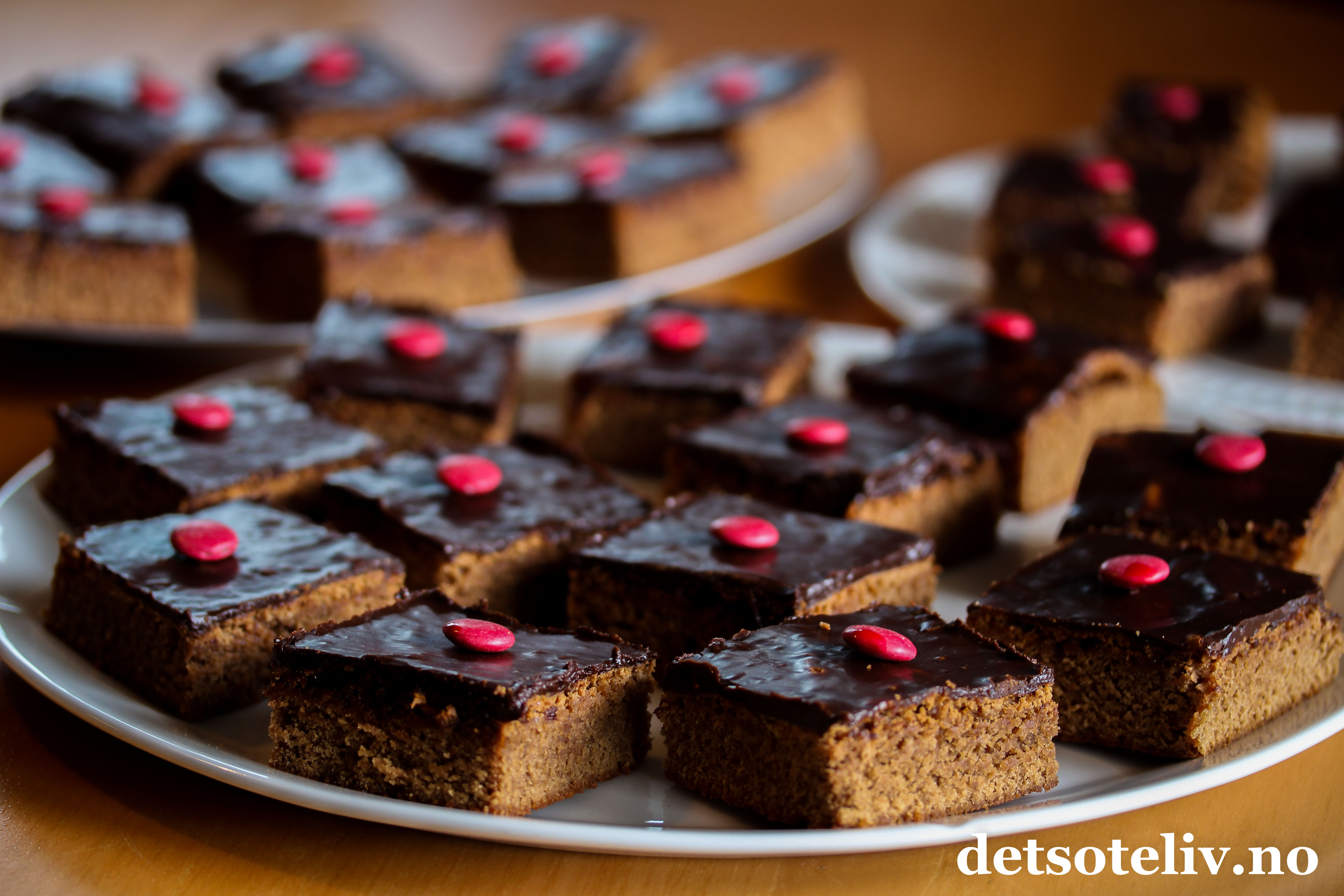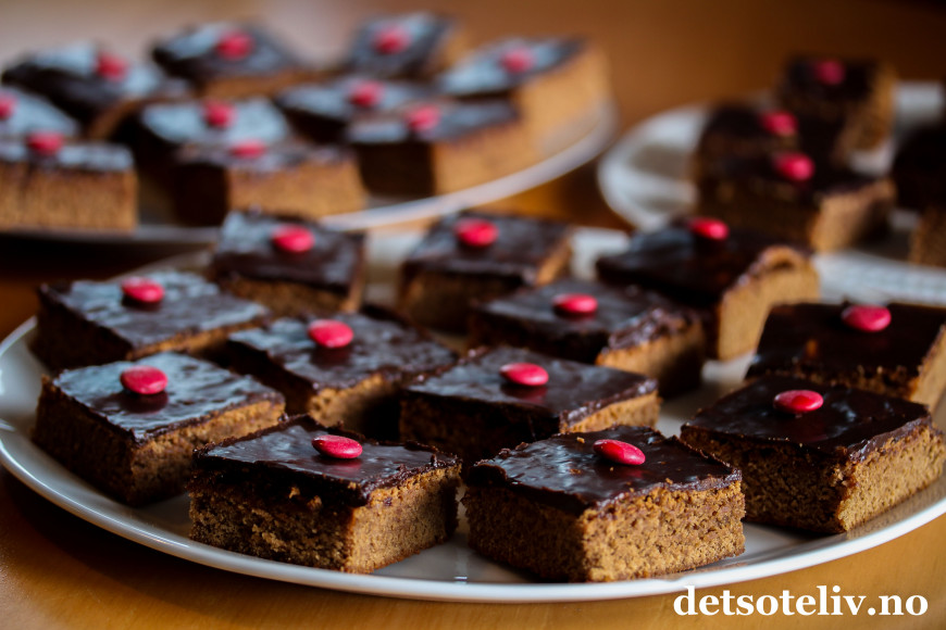 Hell deigen i en stor, bakepapirkledd langpanne (ca 30x40 cm). Stek kaken midt i ovnen ved 180°C i 25 min. Avkjøl kaken helt i formen. Hvelv kaken ut av formen og fjern bakepapiret. Del opp i firkanter.