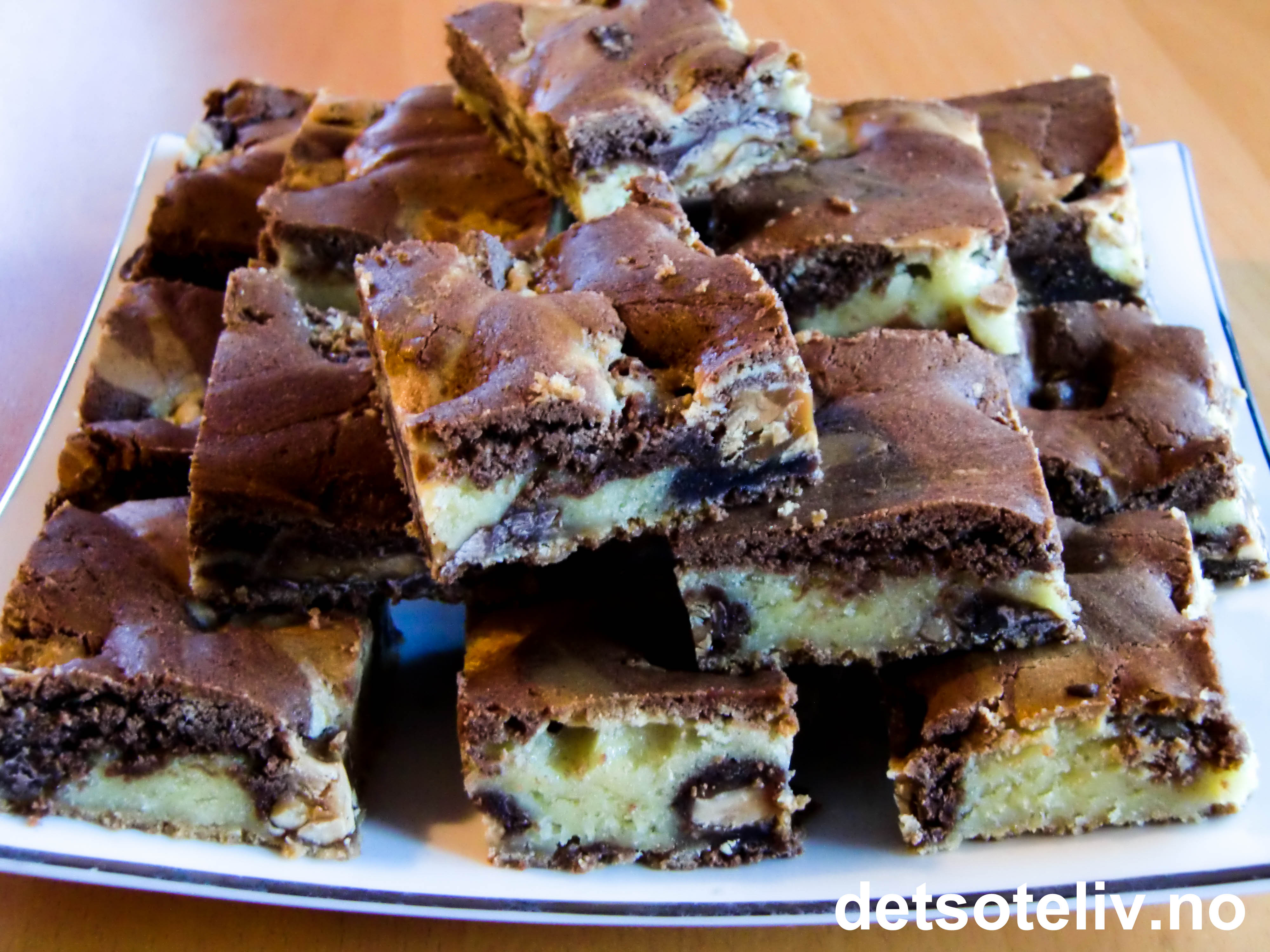 Kle en liten langpanne (ca 20x30 cm) med bakepapir. Ha den mørke og hvite deigen i langpannen i klatter om hverandre så du får en marmorert kake.