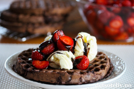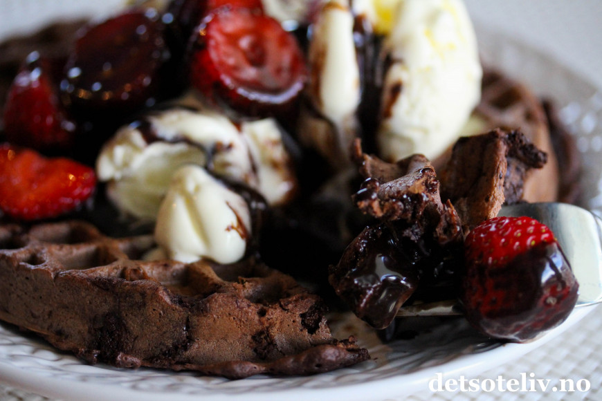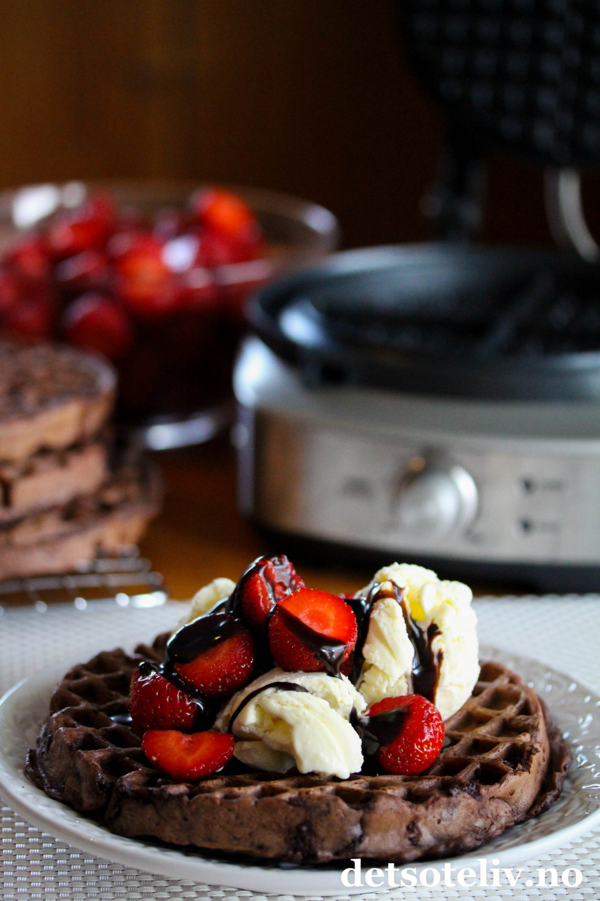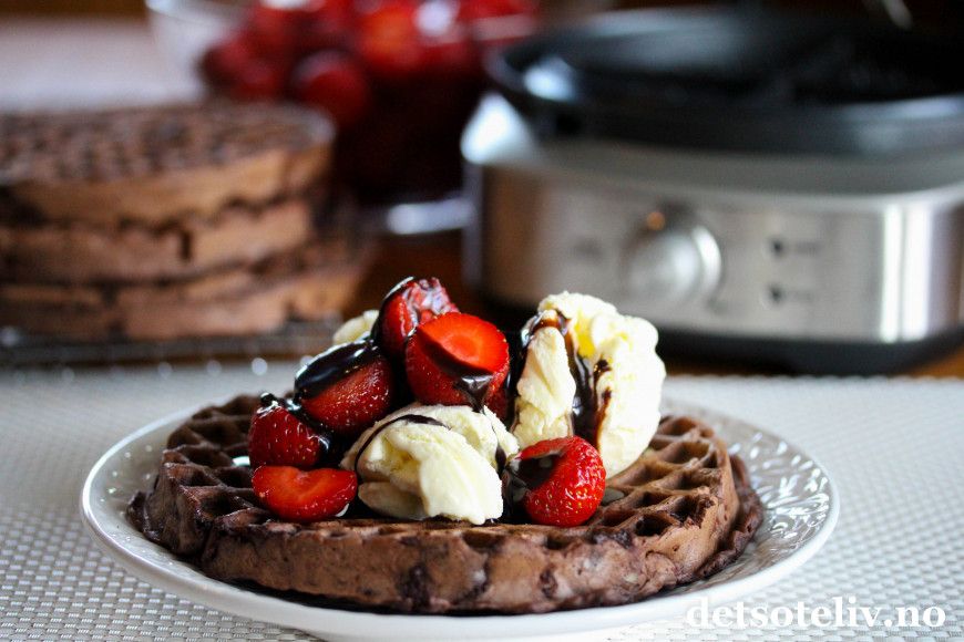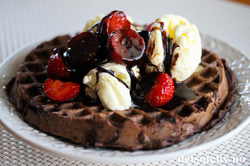 Server sjokoladevaflene nystekte og varme, og gjerne med vaniljeis, jordbær og sjokoladesaus for å få en skikkelig Brownie Waffles Sundae! ![]()