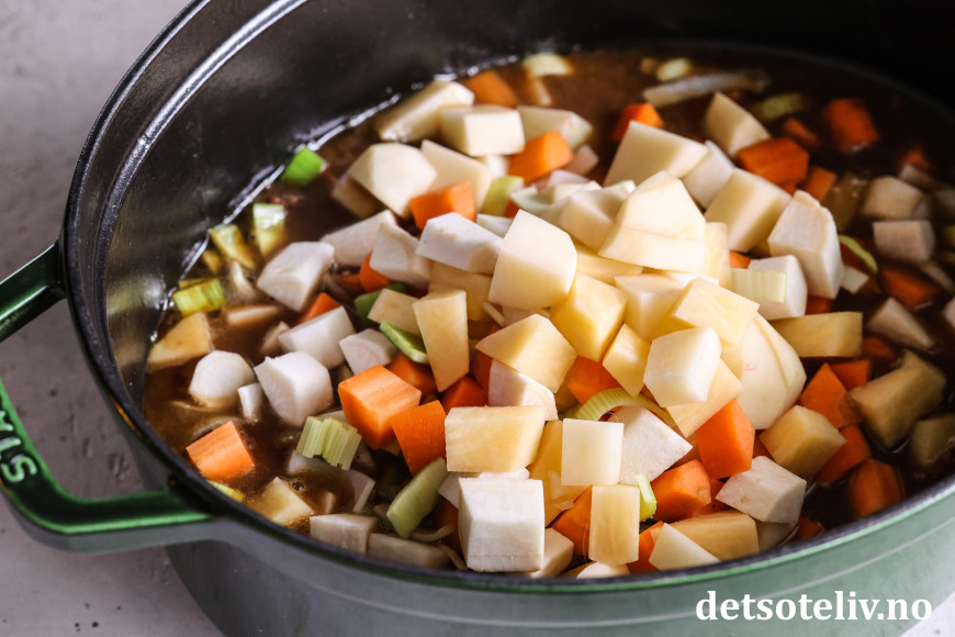 Ha først gulrot-, kålrot- og persillerotbitene i gryten, og eventuelt litt av purreløken. Sett på lokket igjen og la gryten småkoke under lokk i 15 minutter.
