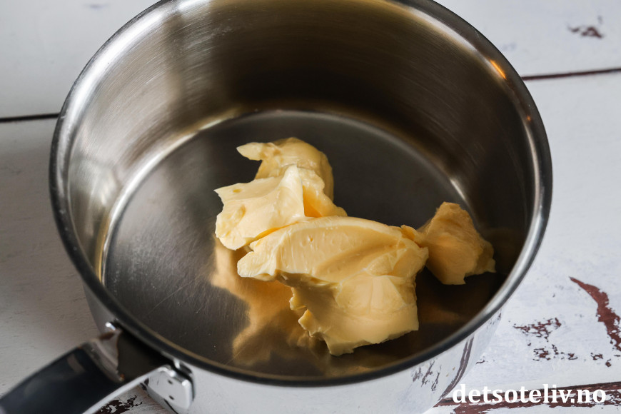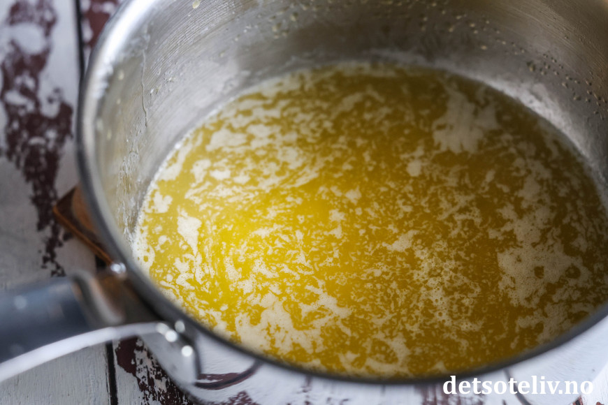 La det smeltede smøret fortsette å varmes til du etter hvert ser at det blir brunt i fargen. Visp i kjelen og pass nøye på så smøret blir brunt og ikke brent.