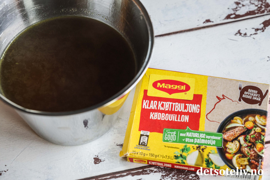♥ Du kan bruke ferdigkjøpt kjøttkraft til den brune sausen, eller du kan bruke 3 chef du fond, kjøtt (à 28 gram) eller 3 terninger kjøttbuljong som du løser opp i varmt vann.